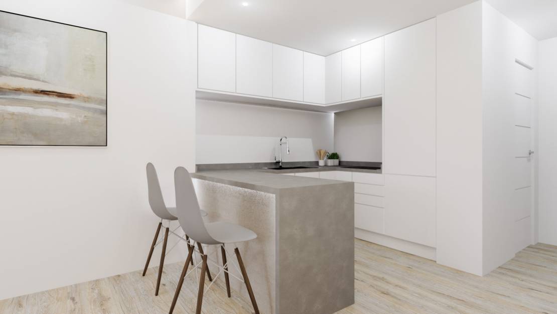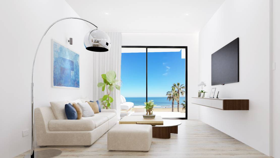 Diese neue Entwicklung am Strand hat verschiedene Modelle von Wohnungen, diese ist an der Ecke (Ost- und Südfassade), mit frontalem Meerblick. Im ersten Stock des Gebäudes steht nur eine Einheit zur Verfügung.