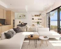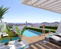Das weiße Musterhaus ist eine Luxus-Doppelhaushälfte mit privatem Pool zum Verkauf in Finestrat. Diese moderne Neubauvilla bietet einen der besten Ausblicke auf die Umgebung.