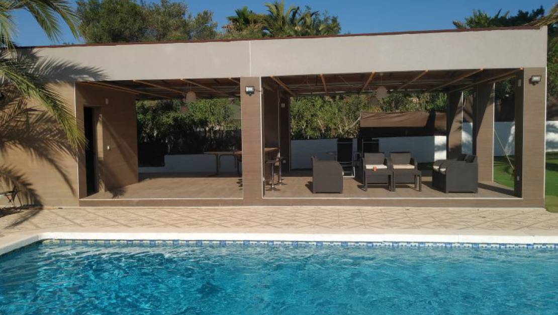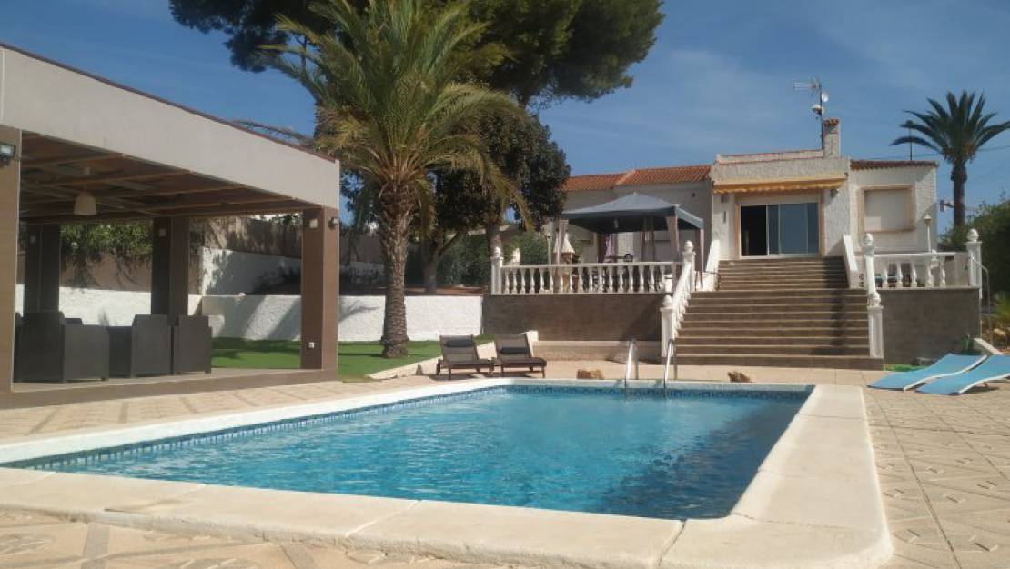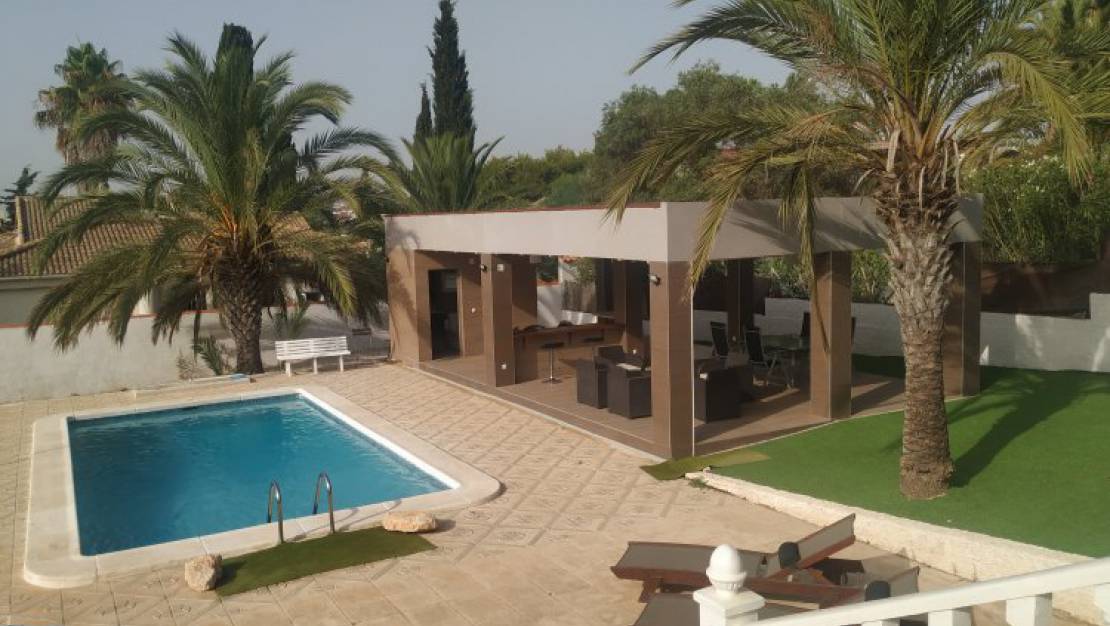 Schöne unabhängige Villa in der Avenida de España, Nr. 50 in Pilar de la Horadada. Das Haus verfügt über 3 Schlafzimmer, Schlafmöglichkeiten für 6 Personen, 3 Badezimmer, amerikanische Küche mit Bar, Wohn- / Esszimmer, Klimaanlage, Smart-TV, WLAN, 1000m2 Garten mit Tischtennisplatte, 8 x 4 privater Pool, Poolhaus, große Terrasse, Grill, Parkgarage für 2 Autos.