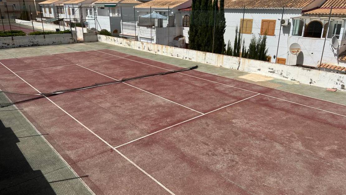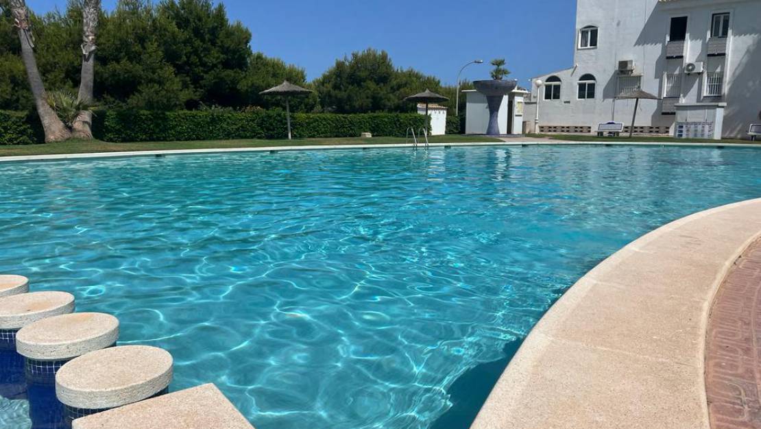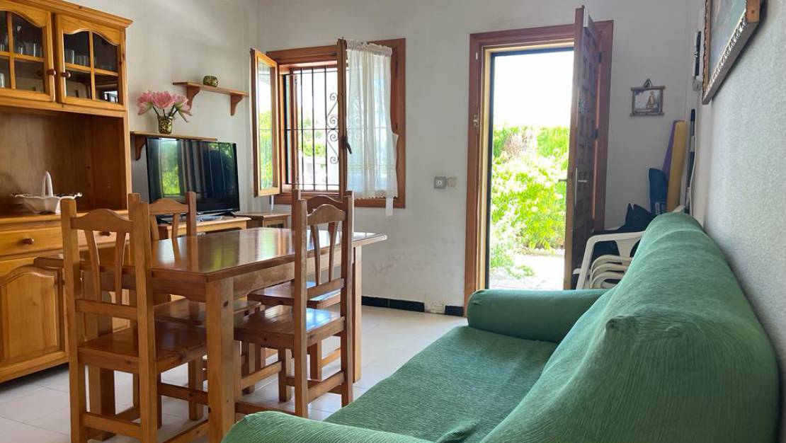 Bungalow im ersten Stock von Torrevieja Torreblanca, 83 m über dem Meeresspiegel. Fläche, Terrasse 25 m2, 2 Schlafzimmer, 2 Bäder, Erdgeschoss in gutem Zustand, Küche, Südlage. Extras: Umkleidekabinen, Garten, Möbel, Gemeinschaftspool, Bus, Strand, Parks, Urbanisierung, freier Blick FANTASTISCH: -