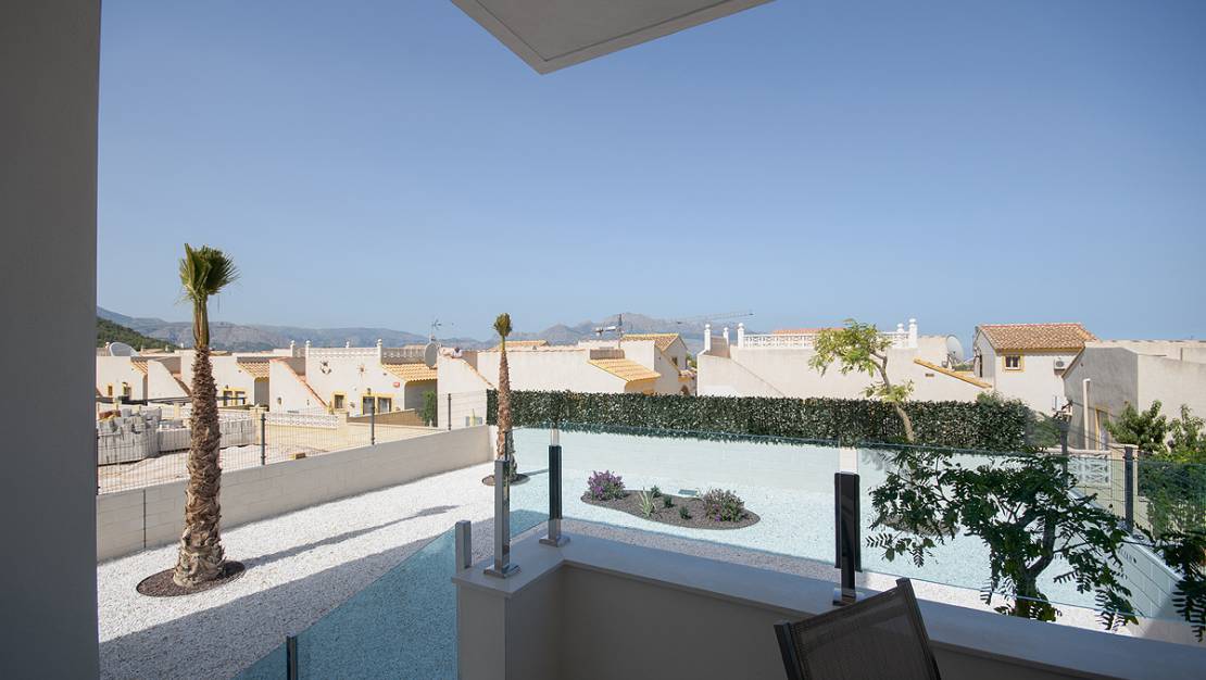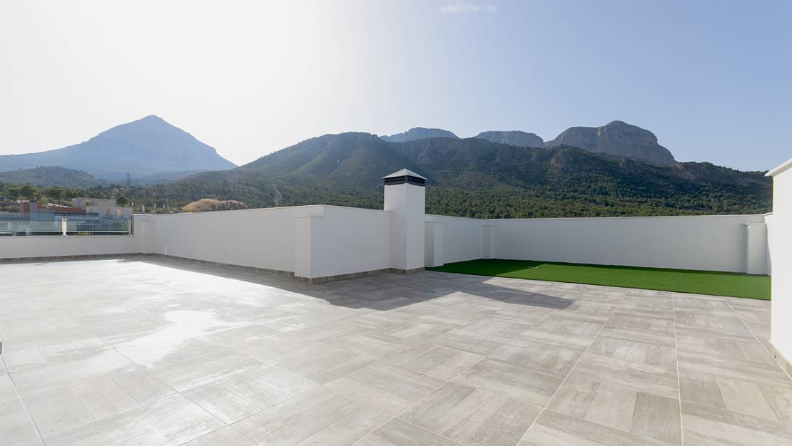 Neue Wohnanlage an der Costa Blanca mit 76 Wohnungen, zwischen dem Mittelmeer und den Bergen. Unter diesem Komplex befindet sich dieser moderne Neubau-Bungalow im Erdgeschoss zum Verkauf in Polop.