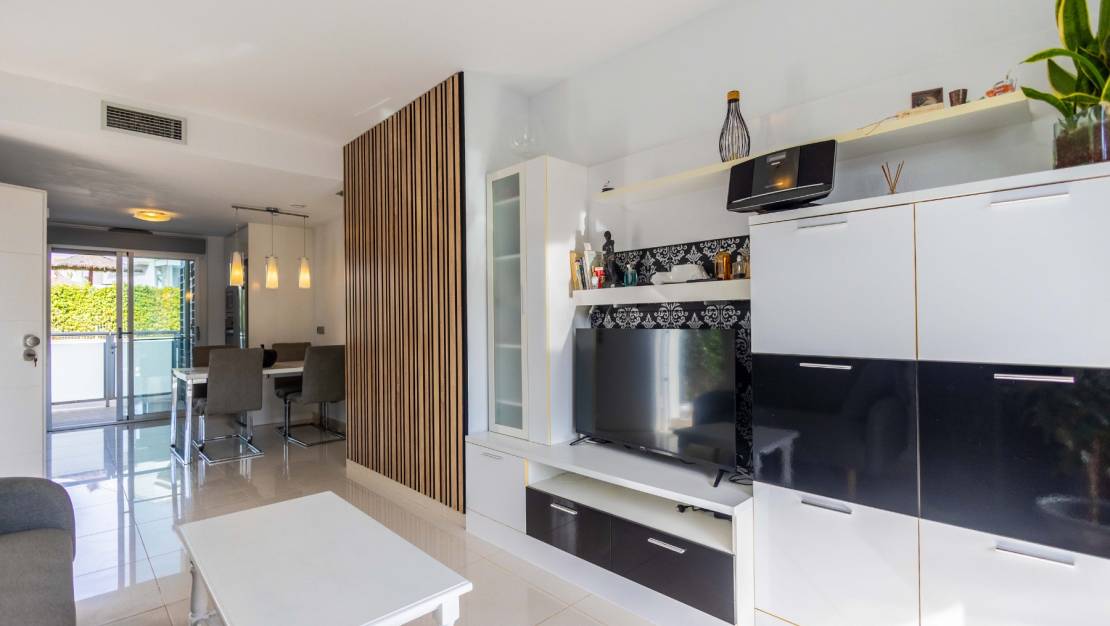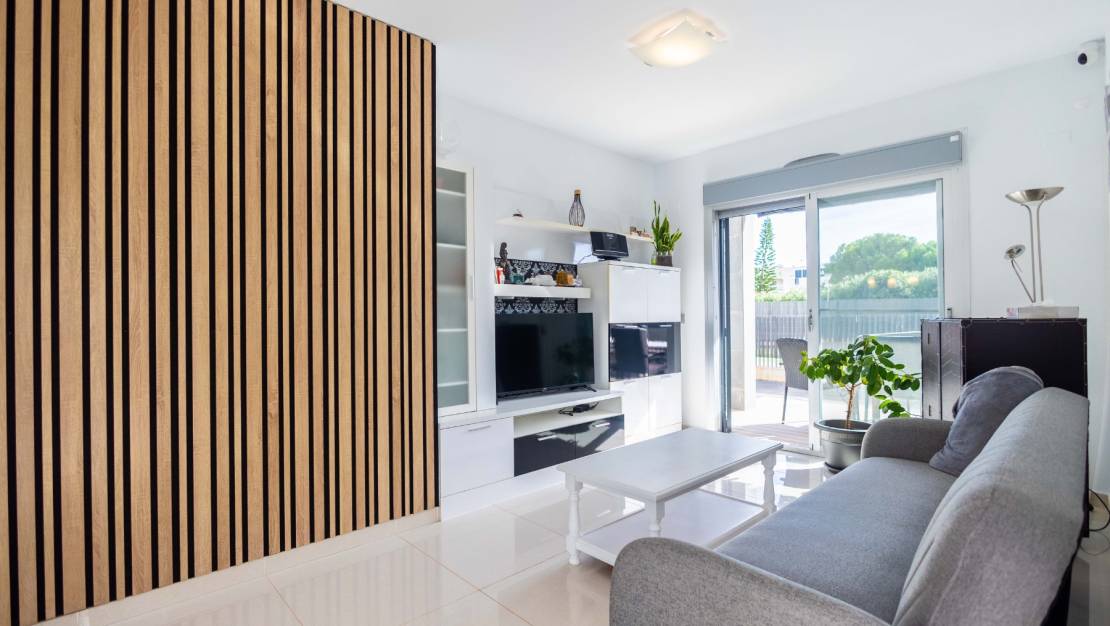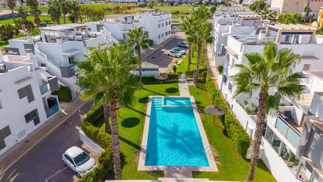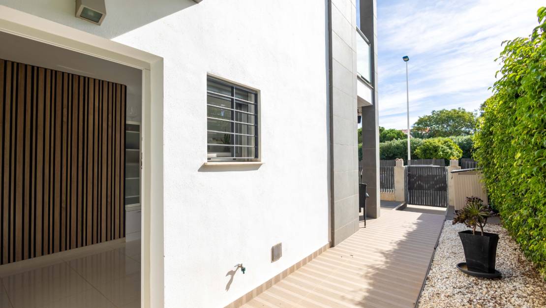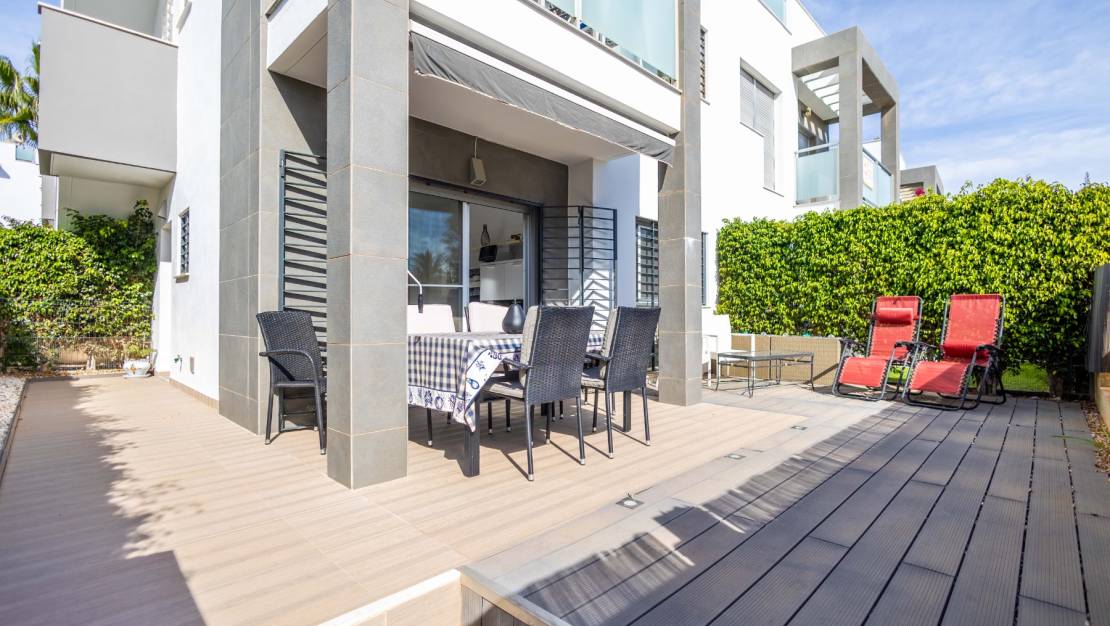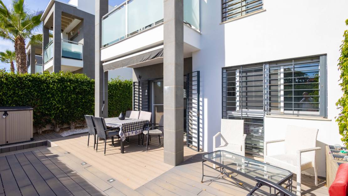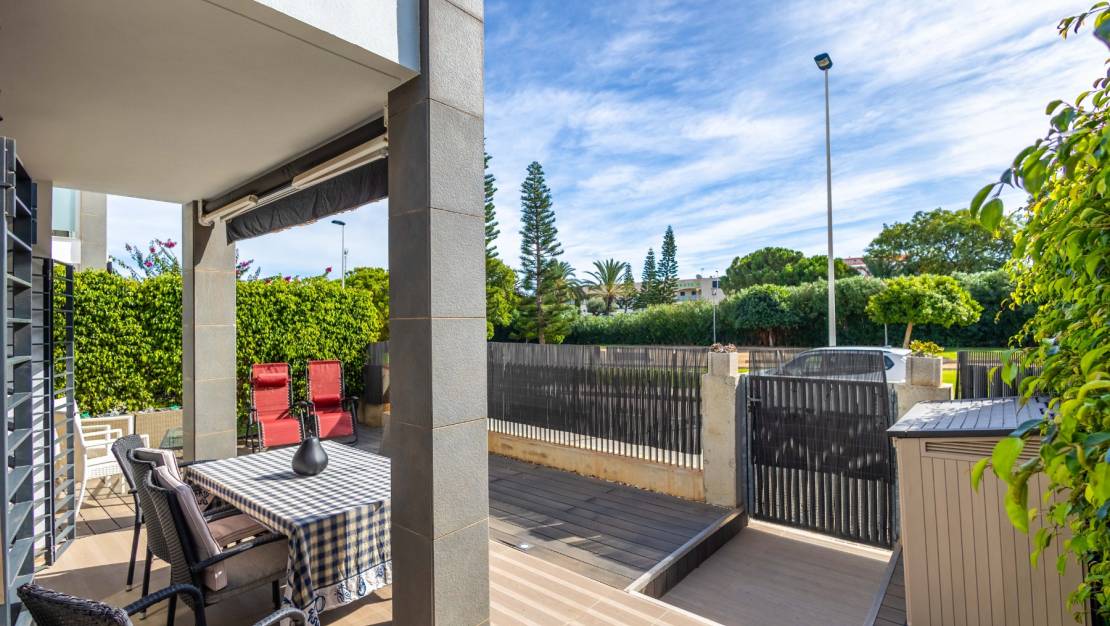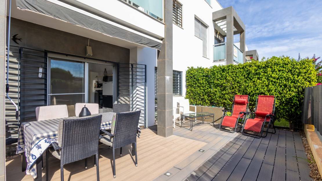 SPAIN ESTATE bietet exklusiv diese moderne Erdgeschosswohnung mit Garten an, gelegen in einer geschlossenen Wohnanlage mit Gemeinschaftspool und privatem Außenparkplatz, in Punta Prima, einer der begehrtesten Wohngegenden an der südlichen Costa Blanca.