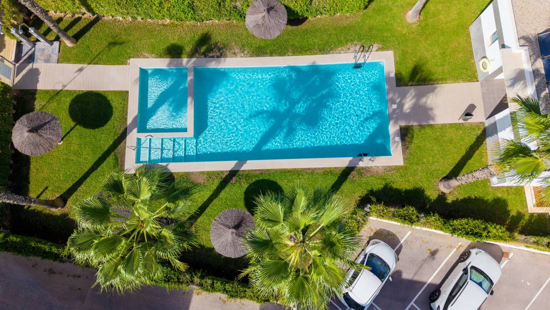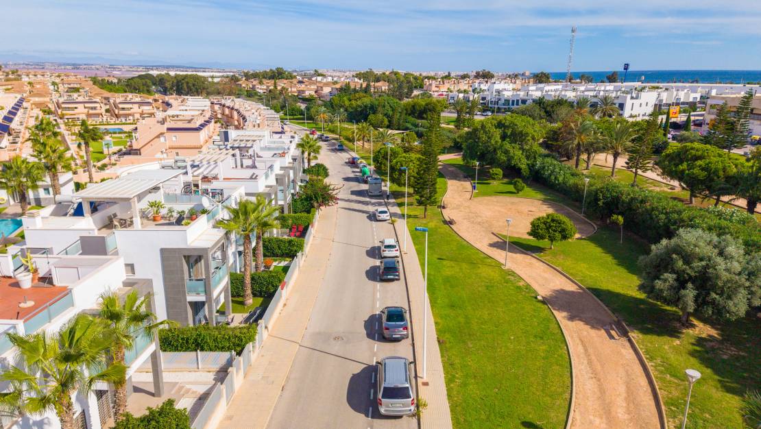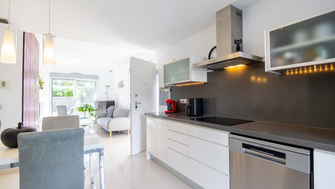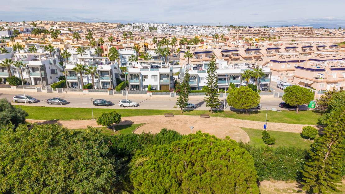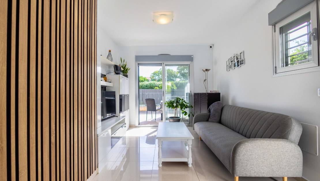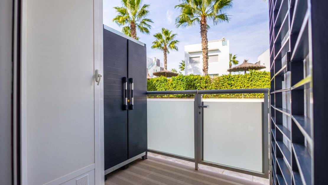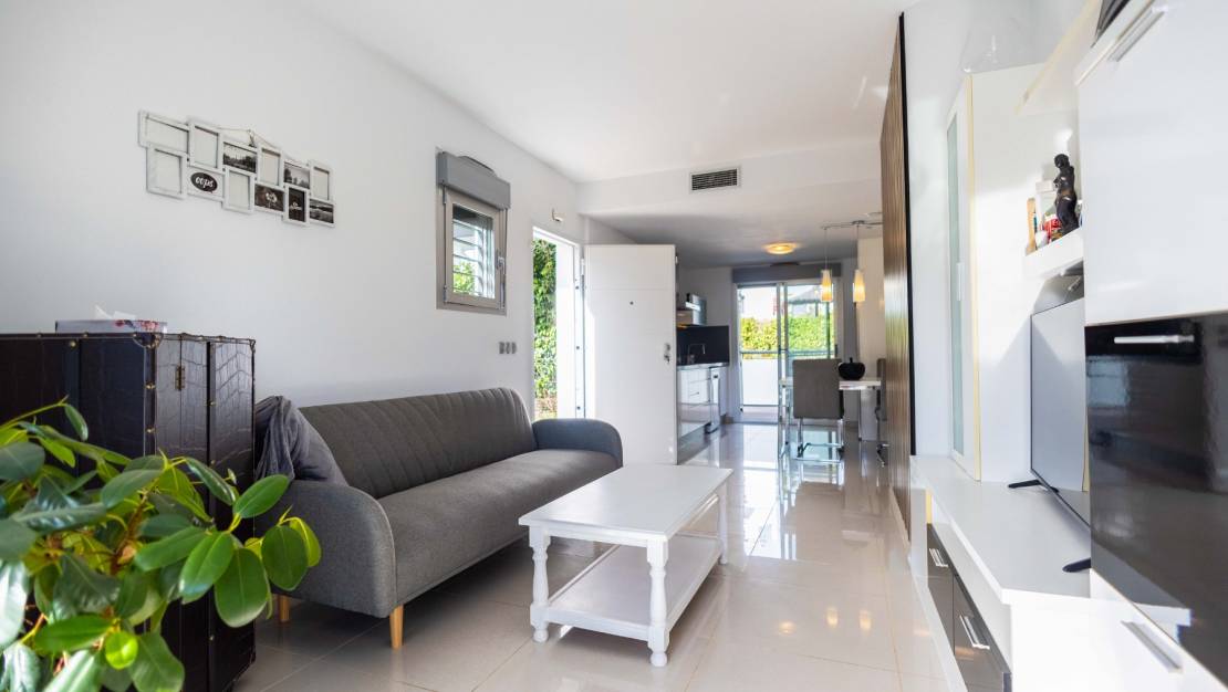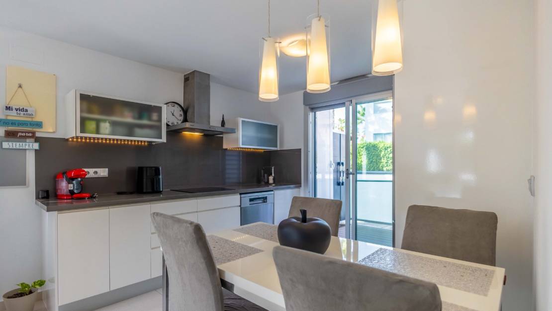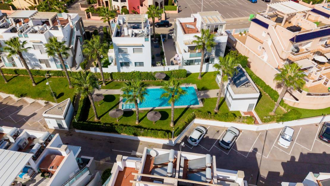 SPAIN ESTATE bietet exklusiv diese moderne Erdgeschosswohnung mit Garten an, gelegen in einer geschlossenen Wohnanlage mit Gemeinschaftspool und privatem Außenparkplatz, in Punta Prima, einer der begehrtesten Wohngegenden an der südlichen Costa Blanca.
