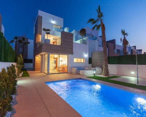 Wir haben Neubau- und Wiederverkaufsbungalows . Sie können ein modernes Design für das Interieur Ihres Hauses mit einer eleganten Küche mit modernsten Geräten und luxuriösen Badezimmern wählen. Wir bieten Ihnen auch Bungalows mit einem typischen traditionellen Design. Ihre Fassaden erinnern an die alten Stadthäuser an der Costa Blanca. Die rötlichen Dächer, die weißen Balustraden, die Bögen der Veranden, die künstlerischen Gitter der Fenster oder die mallorquinischen Fensterläden bieten Ihnen den Charme eines Stadthauses mit einem Interieur, in dem Sie heute allen notwendigen Komfort finden.