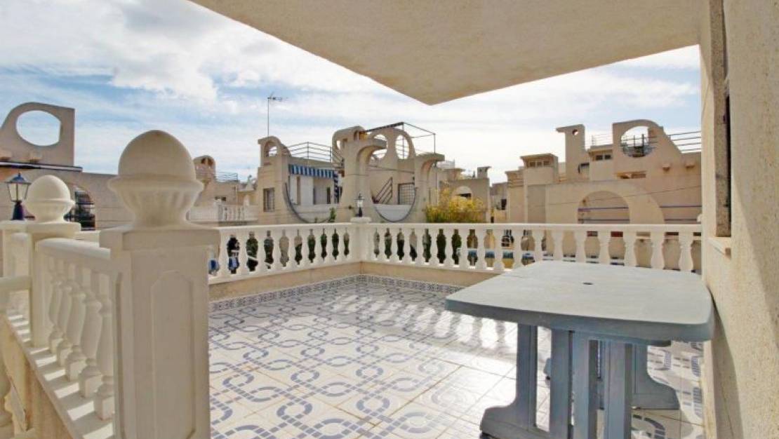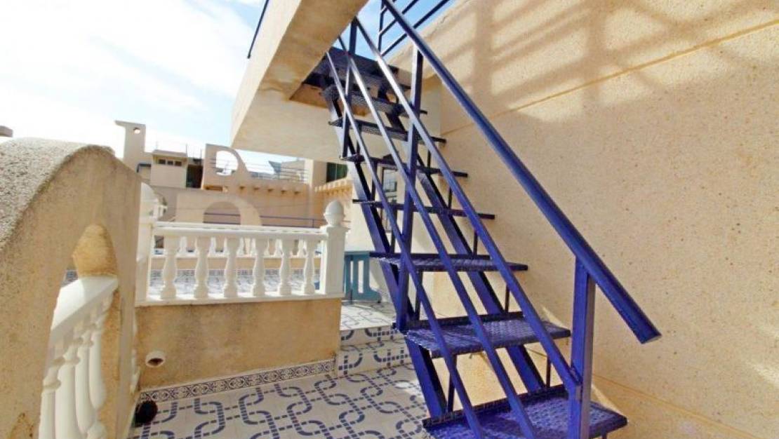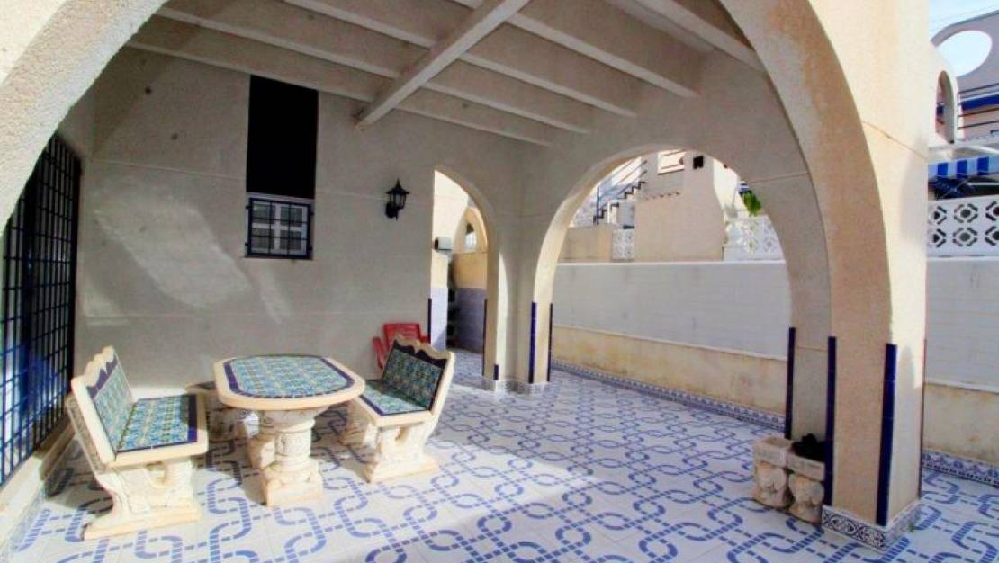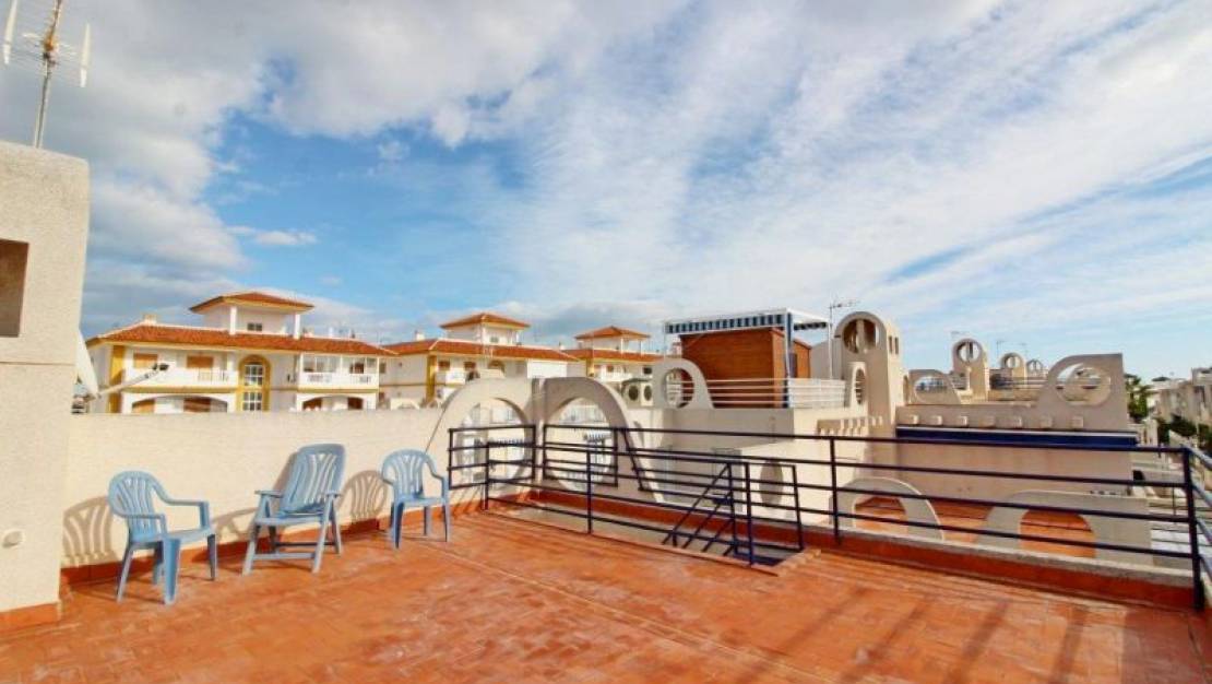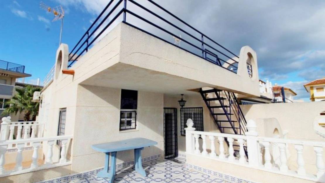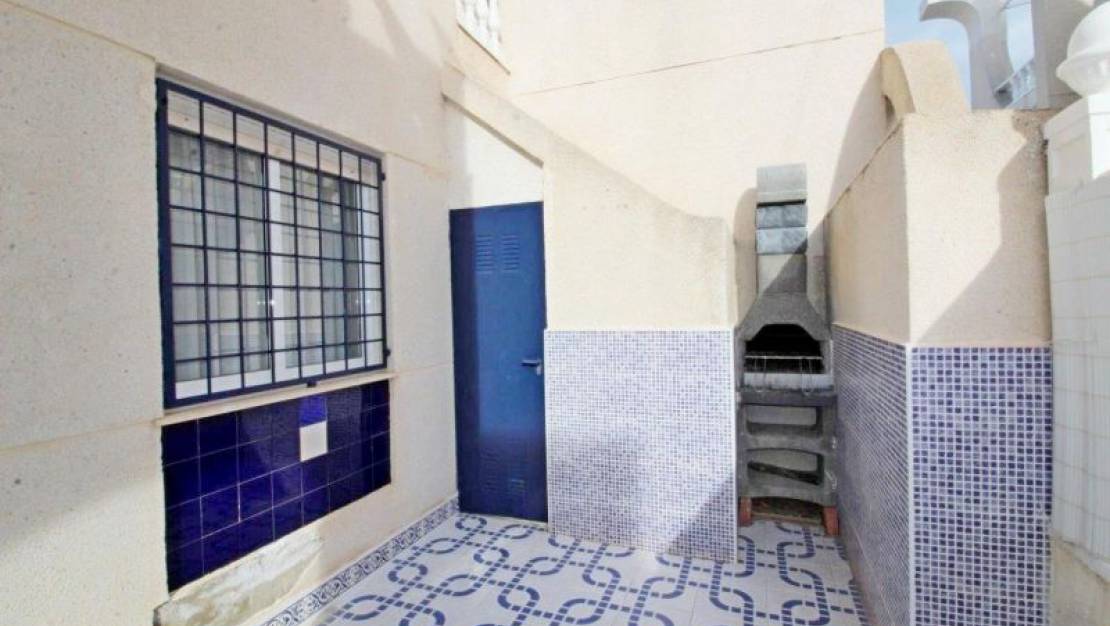 Soleado dúplex de esquina orientado al SUR ubicado en un residencial con piscina comunitaria a solo unos minutos de la playa de La Mata. La casa con una superficie de 70m2 tiene 3 dormitorios (uno en la planta baja), 2 baños completos, una cocina americana, un salón-comedor con acceso al jardín privado, un porche, una barbacoa y un trastero. Gran terraza en el primer piso y solarium privado en el segundo piso. Se entrega con muebles y electrodomésticos según inventario. Ubicación tranquila a un paso de los Centros Comerciales de Torrevieja, rodeado de servicios y tiendas: farmacia, supermercado, restaurantes, centro de salud, parada de autobús, etc.). SUMA 215 euros / año. Comunidad 35 € mes