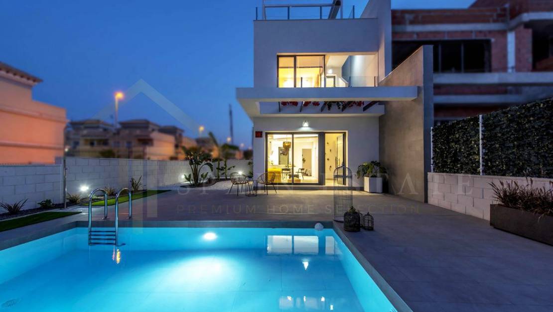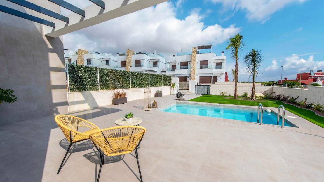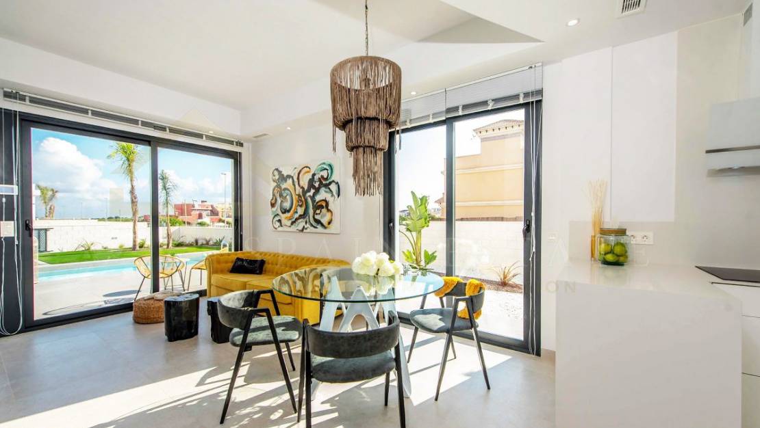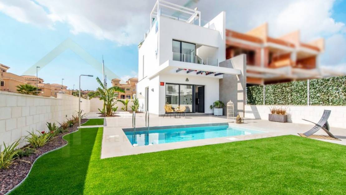 Villa en Villamartin zona Los almendros, 99 m. de superficie, 105 m. superficie parcela, 2 habitaciones dobles y una habitación sencilla, 2 baños, un aseo, propiedad en obra nueva, cocina sólo muebles, orientación sureste.
