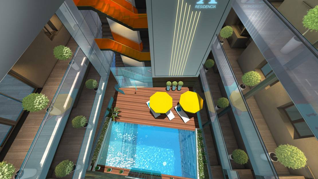 Esta propiedad consta de una habitación doble (con armarios empotrados), cocina integrada totalmente equipada (con barra de desayuno, que incluye electrodomésticos) y sala de estar / comedor de planta abierta. El edificio de cinco pisos tiene un ascensor para todos los pisos, piscina comunitaria climatizada (para uso durante todo el año), área de sauna, parque infantil, dos niveles de estacionamiento subterráneo privado y trasteros privados separados (opcional).