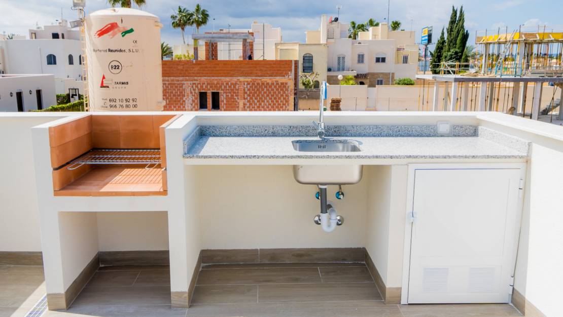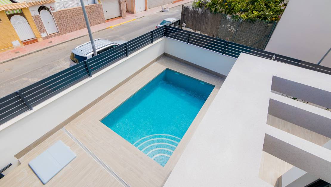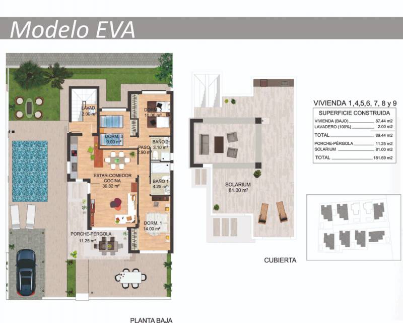 La villa modelo EVA consta de planta baja y solarium, con 3 dormitorios y 2 baños, sala de estar, cocina, terraza, patio, solarium y piscina privada, parcelas de 226 m2 a 276 m2 con una superficie construida de 181,69 m2 cada casa. . La comodidad de vivir en una villa en planta baja con un gran solarium con gran pérgola, zona de barbacoa y ducha, donde podrá disfrutar del clima mediterráneo.