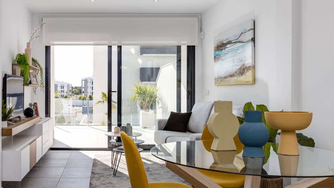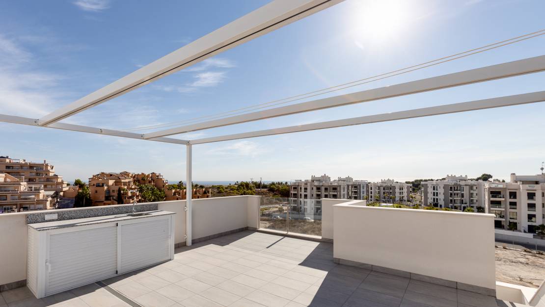 Ático de obra nueva situado en Villamartín, Orihuela Costa. Tiene 73m2 distribuidos en 2 dormitorios, 2 baños, salón comedor, cocina, terraza delantera. y amplio solarium. El piso incluye plaza de garaje. Dispone de amplias zonas verdes comunes con piscina comunitaria.