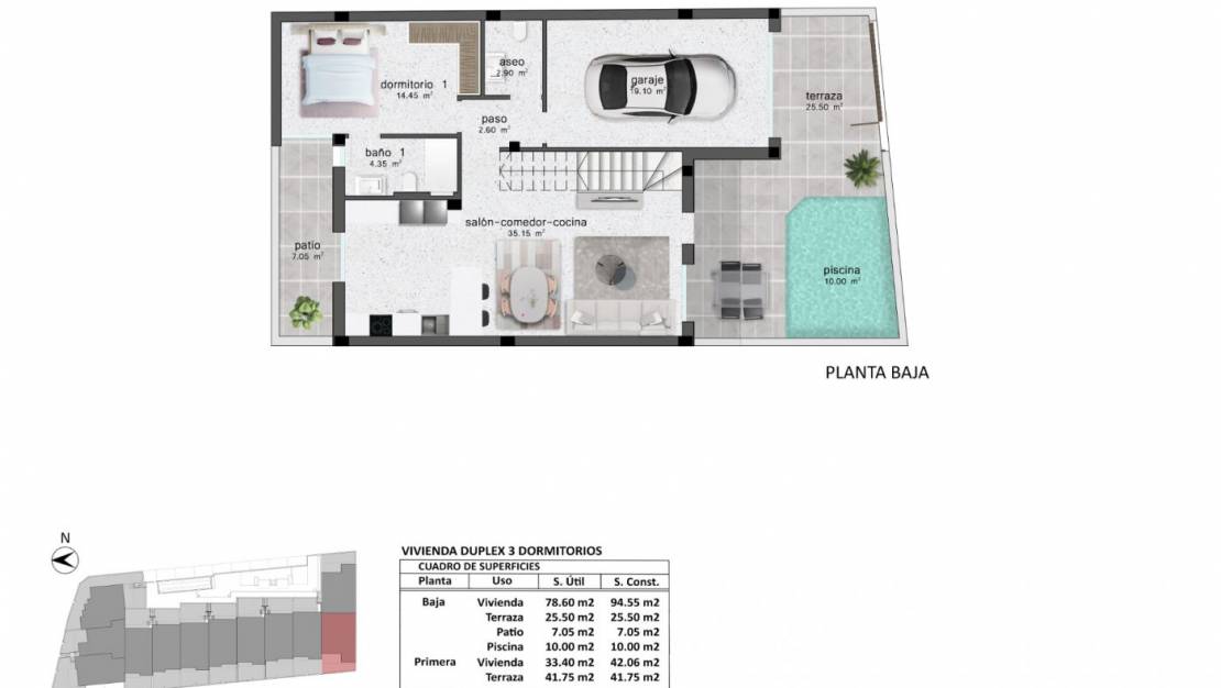ADOSADOS DE OBRA NUEVA EN PILAR DE LA HORADADA~ ~ Residencial exclusivo de obra nueva de modernos adosados y bungalows en Pilar de la Horadada.~ ~ Adosados de obra nueva de 3 dormitorios, 3 banos.~ ~ El espacio vital consiste en un gran salón/comedor de planta abierta y una cocina totalmente equipada con grandes puertas correderas que incorporan el espacio exterior. ~ ~ Los dormitorios tienen un montón de espacio, un armario empotrado. Los cuartos de baño están completamente amueblados y equipados con mamparas de ducha, armarios y espejos con una agradable iluminación LED y de espejo de bajo nivel y calefacción por suelo radiante.~ ~ Todas las viviendas disponen de una plaza de aparcamiento privada.~ ~ ~ Pilar de la Horadada es un típico pueblo español en la parte más meridional de la Costa Blanca.~ ~ La gran calle principal tiene supermercados, muchas tiendas, restaurantes y bares y algunas plazas encantadoras. ~ ~ Las hermosas playas de Torre de la Horadada y Mil Palmeras con paseo marítimo de arena fina está a sólo 5 minutos. ~ ~ Los aeropuertos de Corvera (Murcia) y Alicante están a 40 y 55 minutos respectivamente~
