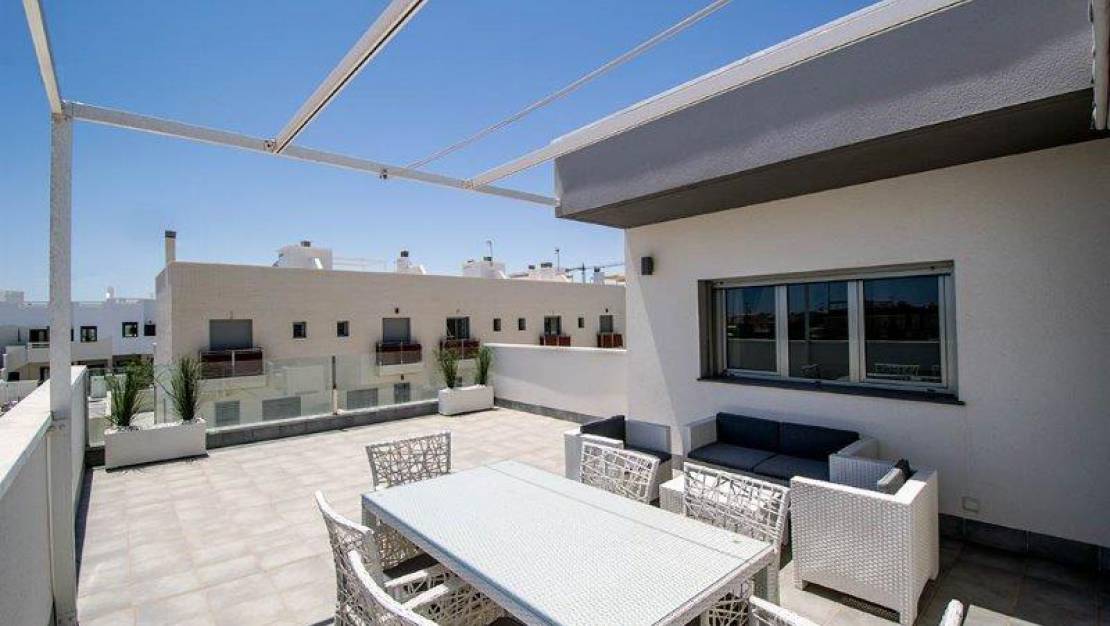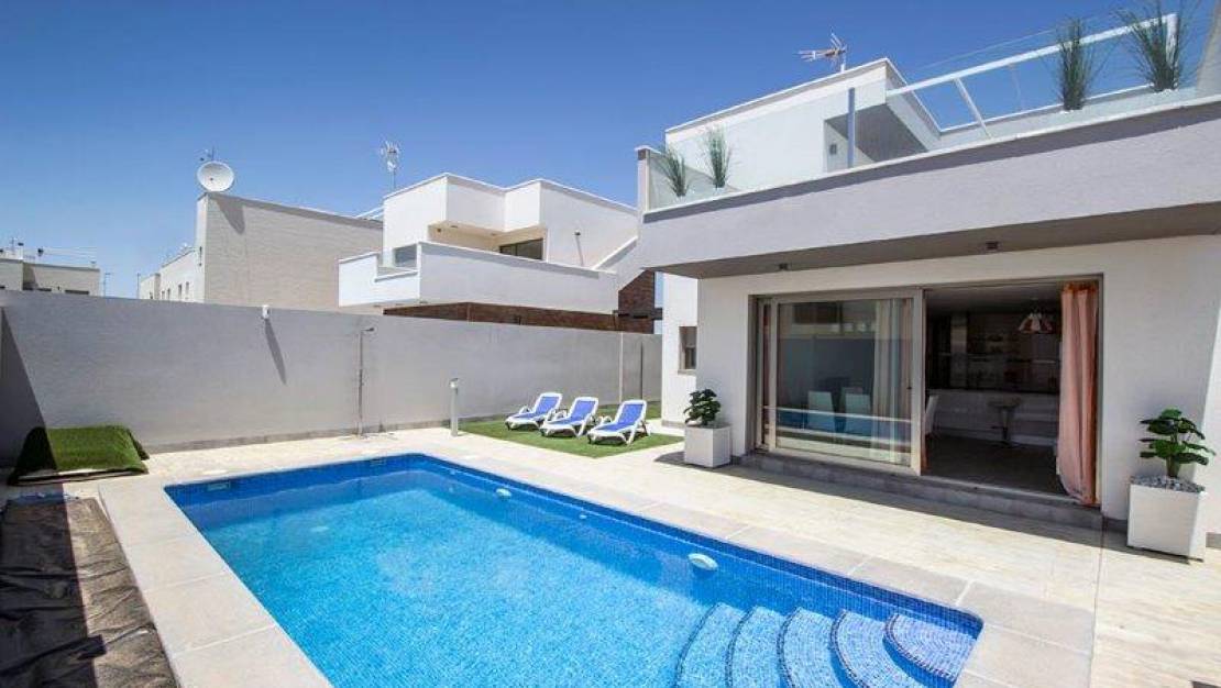 Villa de estilo moderno a 200 metros de la playa en Torre de la Horadada. La propiedad consta de tres habitaciones dobles y dos baños en dos niveles. Uno en la planta baja y dos en el primer piso, el principal con amplia terraza con vista a la piscina y dos baños, uno en suite, cocina integrada moderna totalmente equipada con barra de desayuno e incluye electrodomésticos y área de sala / comedor de planta abierta, que conduce al gran jardín privado con comedor exterior cubierto, piscina, ducha al aire libre y estacionamiento fuera de la calle con puertas electrónicas. El desarrollo se encuentra en un entorno tranquilo y natural, a pocos metros de una serie de playas con bandera azul, rodeado de muchos parques y áreas verdes, y cerca de todas las comodidades necesarias, así como áreas de compras / entretenimiento y algunos excelentes campos de golf. Con fácil acceso a los aeropuertos de Alicante y Murcia, llegar aquí nunca ha sido tan fácil.