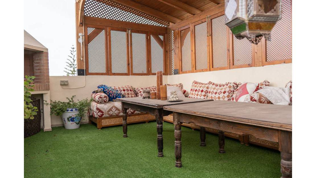 - 1er étage : séjour aux finitions arabes, une salle de bain, une chambre double, une chambre avec un lit gigogne et une terrasse vitrée avec accès au jardin