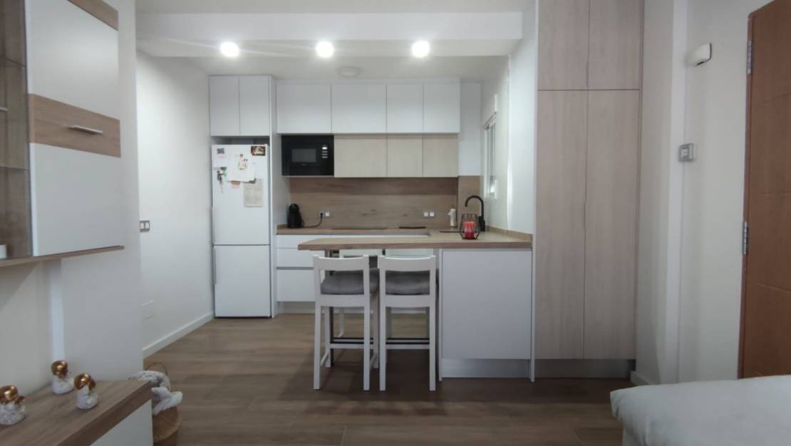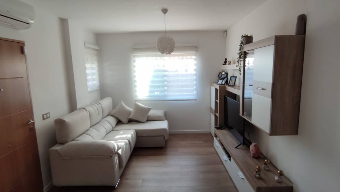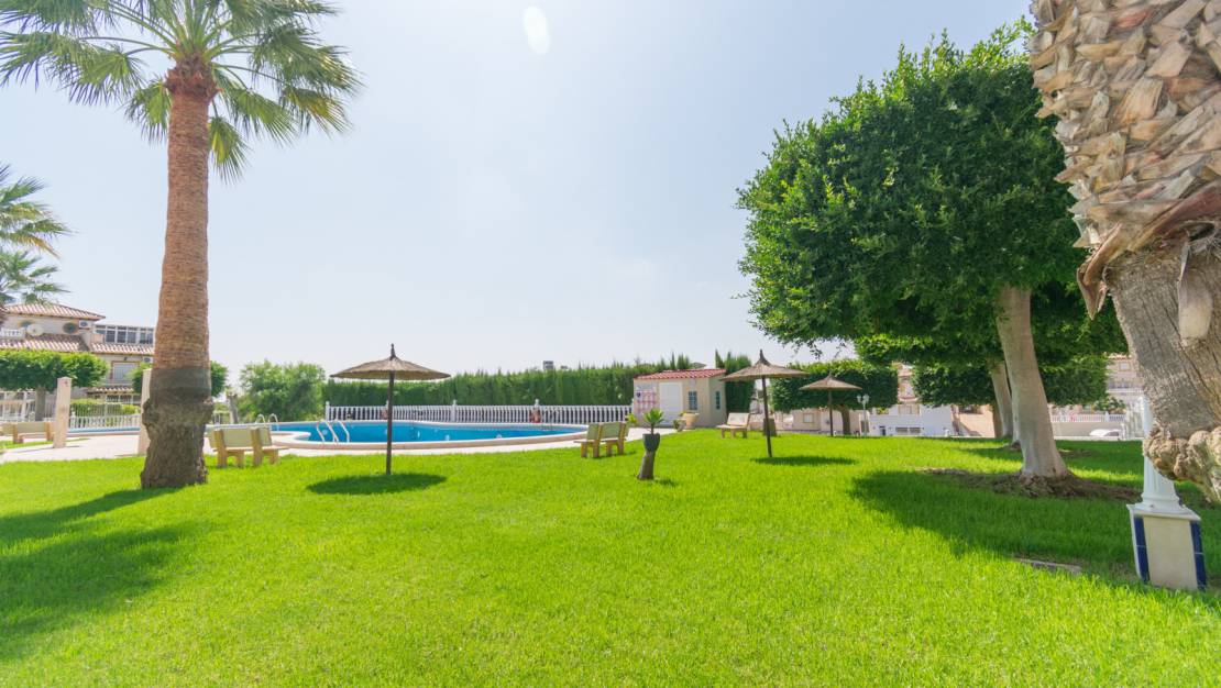 Cette maison est située au premier étage d'un immeuble dans une zone clôturée avec des espaces verts et une piscine commune.
