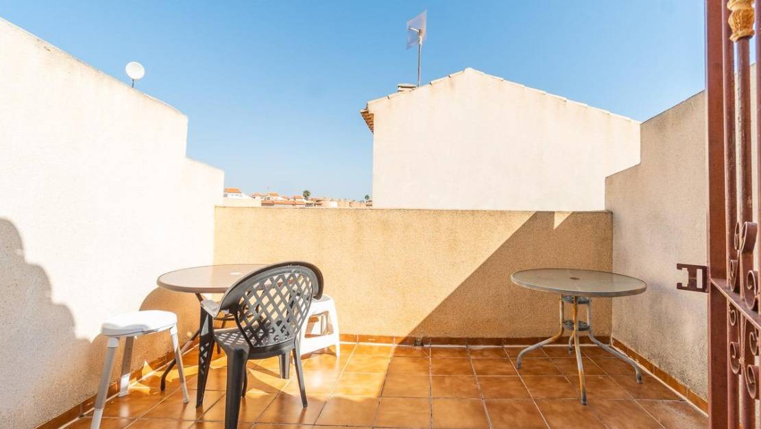Au cœur de Playa Flamenca, à deux pas du centre commercial Zenia Boulevard, des plages, des installations sportives, des espaces de loisirs et des écoles, se trouve ce magnifique triplex mitoyen, baigné de lumière grâce à son orientation plein sud.. . Située dans une résidence sécurisée avec portail automatique, elle offre un vaste parking dans les rues d'accès et une piscine commune centrale, garantissant calme et intimité. Son orientation plein sud assure un ensoleillement optimal tout au long de la journée. Un solarium à l'arrière offre un ombrage bienvenu durant l'été, lorsque la façade est trop chaude. Une terrasse à l'entrée permet de profiter du soleil en toute saison. La maison comprend un séjour/salle à manger avec cheminée, une cuisine séparée permettant de cuisiner en toute tranquillité, et un accès direct depuis la cuisine à un patio couvert avec toit en aluminium et verre. Ce patio peut être aménagé en second salon, en buanderie, voire en chambre pour les personnes à mobilité réduite, car il dispose d'une salle de bain avec douche. Le premier étage, accessible par un escalier intérieur, comprend deux chambres avec placards intégrés, dont une avec balcon, et une salle de bain complète avec douche à l'italienne. Le troisième et dernier étage offre une troisième chambre mansardée avec salle de bain attenante (douche), idéale pour des enfants ou des adolescents, grâce à sa terrasse-solarium accessible uniquement depuis ce niveau. La maison est meublée, entièrement équipée (électroménager inclus) et en parfait état de fonctionnement. Elle est prête à être habitée immédiatement. Que ce soit comme résidence secondaire ou principale, une visite s'impose pour découvrir tous ses atouts.