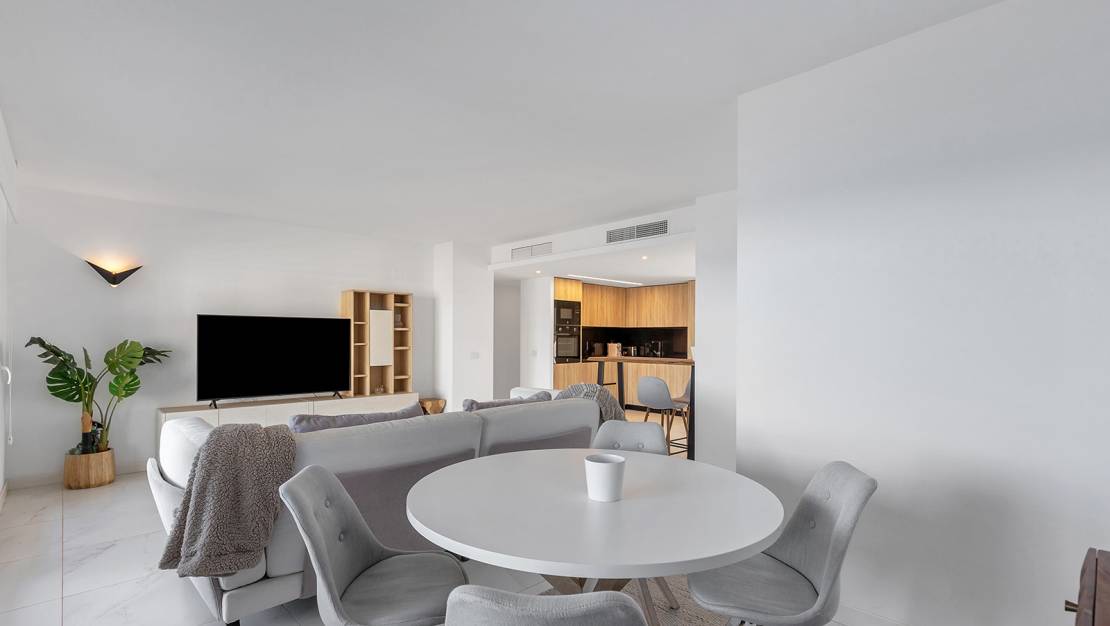 Cet appartement exclusif au cinquième étage est situé dans le prestigieux complexe résidentiel Posidonia, en première ligne de mer à Punta Prima. Initialement conçu avec trois chambres, le logement a été modifié sur plan pour offrir 94 m² de pur confort, répartis désormais en deux chambres spacieuses et deux salles de bains, offrant ainsi une amplitude exceptionnelle dans les pièces de vie. Son point fort réside dans sa double orientation et ses espaces extérieurs : une terrasse de 16 m² avec vue dégagée sur la mer et la baie de Torrevieja, et une seconde terrasse arrière de 12 m² orientée sud avec vue vers La Manga, garantissant soleil, lumière naturelle et ventilation croisée tout au long de la journée. La propriété est vendue entièrement meublée, avec une place de parking souterrain et un débarras inclus. Le complexe dispose d'espaces communs de haut standing et de sécurité. Situé à distance de marche des services, supermarchés et criques, il se trouve à environ 45 minutes de l'aéroport d'Alicante, alliant luxe et confort dans l'une des zones les plus prisées de la Costa Blanca.