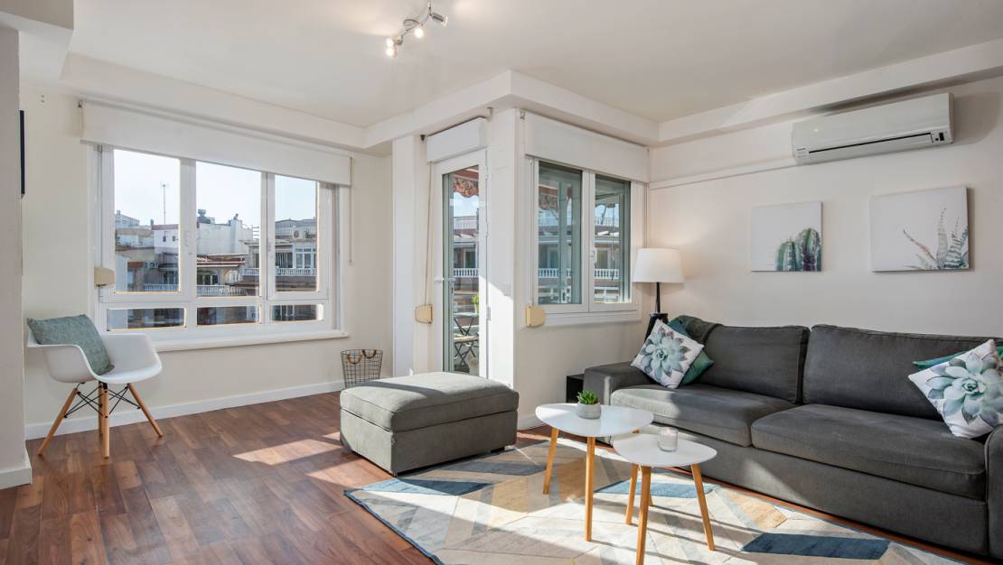 Het appartement is verdeeld in twee grote slaapkamers, 1 badkamer, 1 ruime en lichte keuken, 1 grote woonkamer en een gemeubileerd terras met uitzicht op zee.