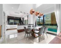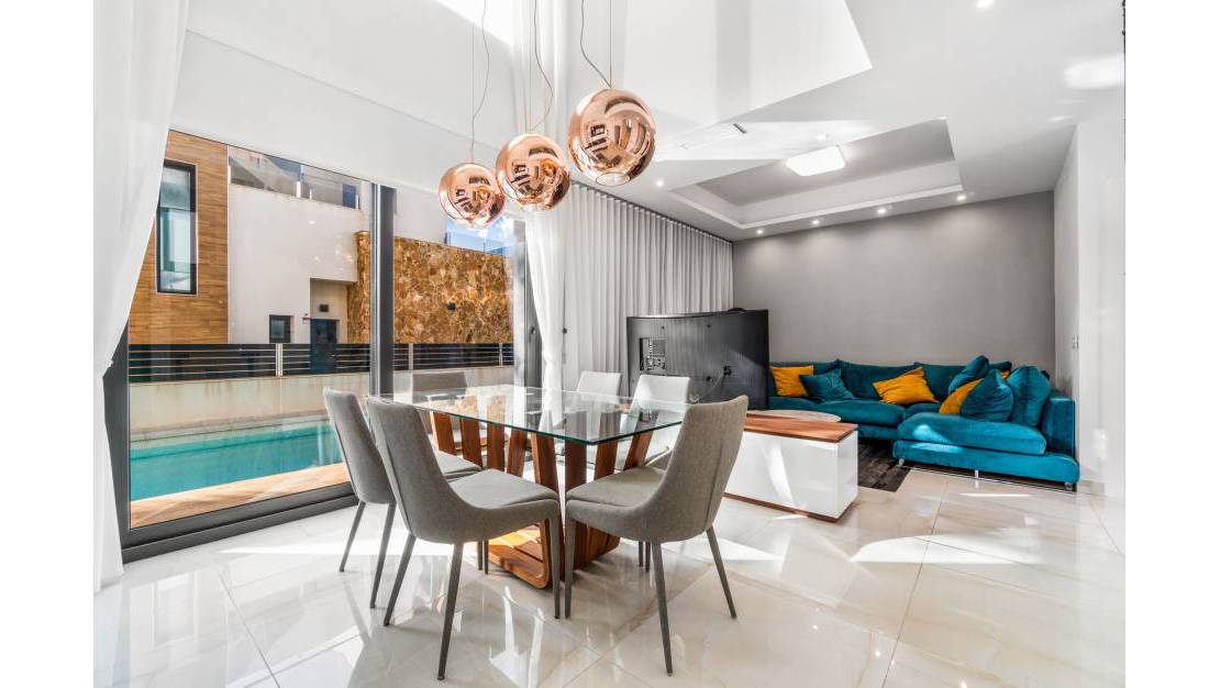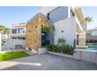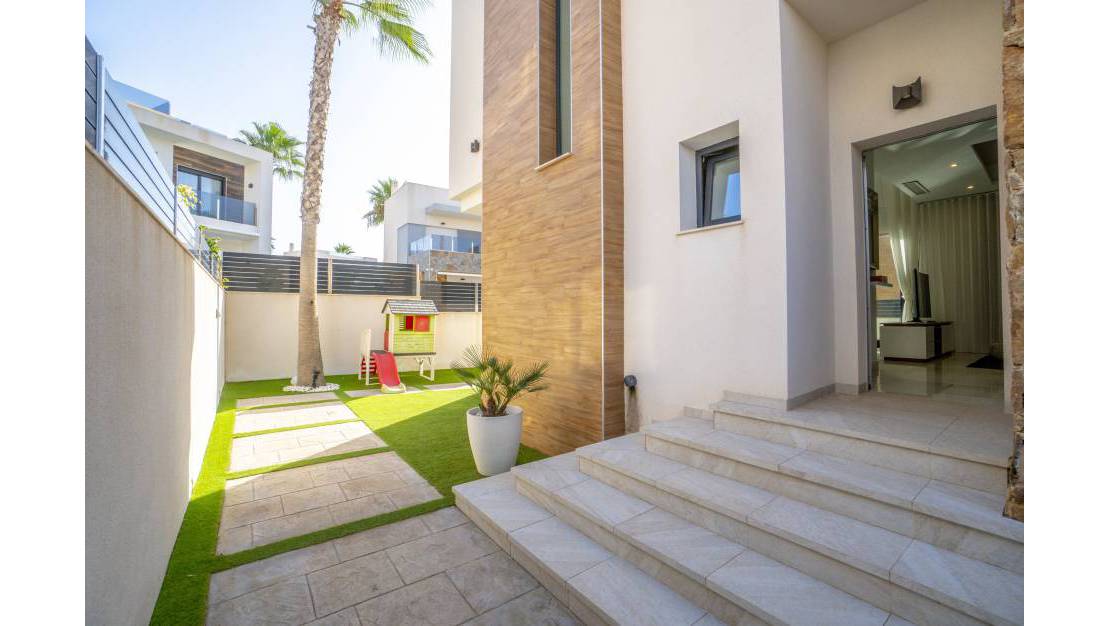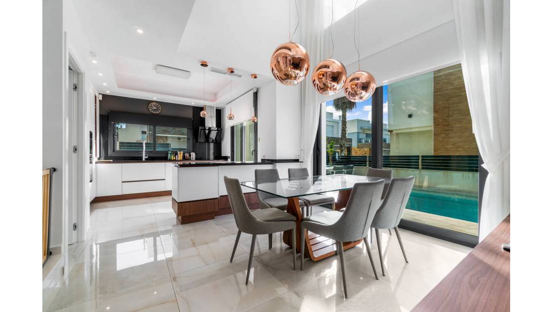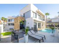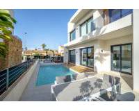 Aguas nuevas is located a few minutes from the center of Torrevieja. Close to all services such as restaurants, supermarkets and shopping centers, such as Habaneras and Zenia Boulevard. Surrounded by coves and blue flag beaches such as Playa de La Mata, Torrevieja and Orihuela Costa.rnrnStunning, modern 4 bedroom, 4 bathroom, 196m2 detached villa in Aguas Nuevas. The ground floor features of a spacious living-dining room with large windows to maximize natural light, a kitchen with an american bar, 1 bedroom and 1 bathroom. On the first floor we find 2 large bedrooms with en-suite bathrooms, a small terrace and access to the private solarium with sea views. The basement is very spacious and divided into living room, full bathroom and 1 bedroom. The property has top quality finishes, electric shutters throughout the house, air conditioning and home automation. Parking entrance for 2 cars.