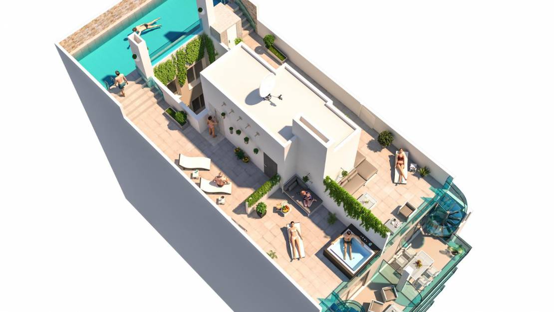 In totaal 10 appartementen met twee slaapkamers en twee badkamers, terrassen en solarium met gemeenschappelijk zwembad.