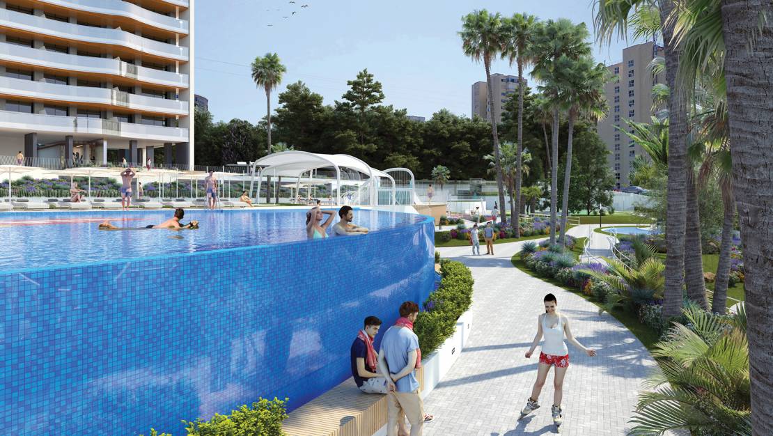 Het exterieurontwerp van de Residential Sunset Waves, avant-garde en verfijnd, moderniseert de skyline van het westelijke strand van Benidorm. Dit kolossale project herbergt gemeenschappelijke ruimtes en recreatie van meer dan 10.000 m² waar grote tuinen, zwembaden met jacuzzi's, chill out loungeruimte en een strandgedeelte van meer dan 2000 m² met natuurlijk gras, ruimte hebben. De residentie heeft ook een groot sportterrein met een tennisbaan, paddletennis, sportveld, petanquebanen en een panoramische fitnessruimte van 150 m² die de meest veeleisende atleten gelukkig zal maken. Degenen die de voorkeur geven aan ontspanning en rust kunnen genieten van de picknickplaatsen en schaaktafels, massageruimtes en sauna die de faciliteiten van dit geweldige resort compleet maken. Het kindergedeelte, met park, klimmuur en zwembad in een beveiligde perimeter, is de perfecte omgeving voor uw kinderspelletjes.
