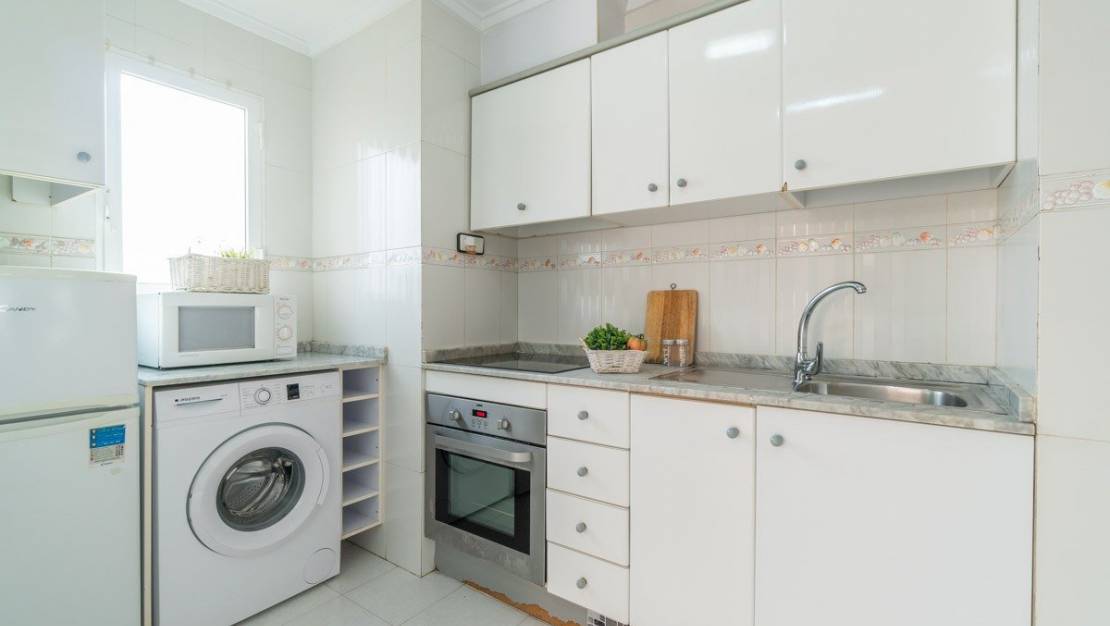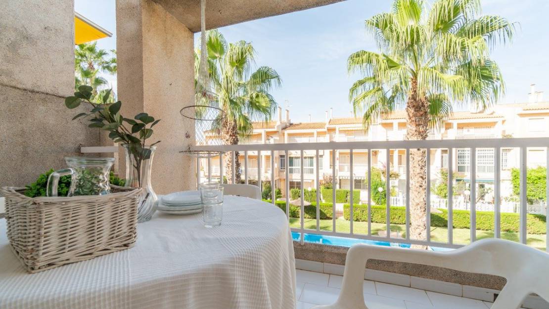 Het huis is gelegen in een privé urbanisatie met prachtige groene zones en een gemeenschappelijk zwembad dat het hele jaar geopend is. Het heeft 58 m2 bebouwd en is verdeeld in een ruime woonkamer, volledig uitgeruste keuken, 2 slaapkamers, een badkamer en het beste van alles een groot balkon van 13m2 met uitzicht op het zwembad en de groene zones.