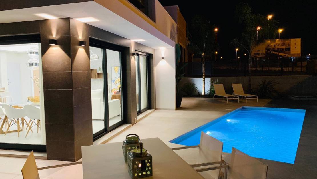 Huset har 125 kvadratmeter med tre soverom og 2 bad, har også et stort solarium, terrasse, parkering, valgfritt privat basseng og ferdig hage. Høy kvalitet og moderne stil design.