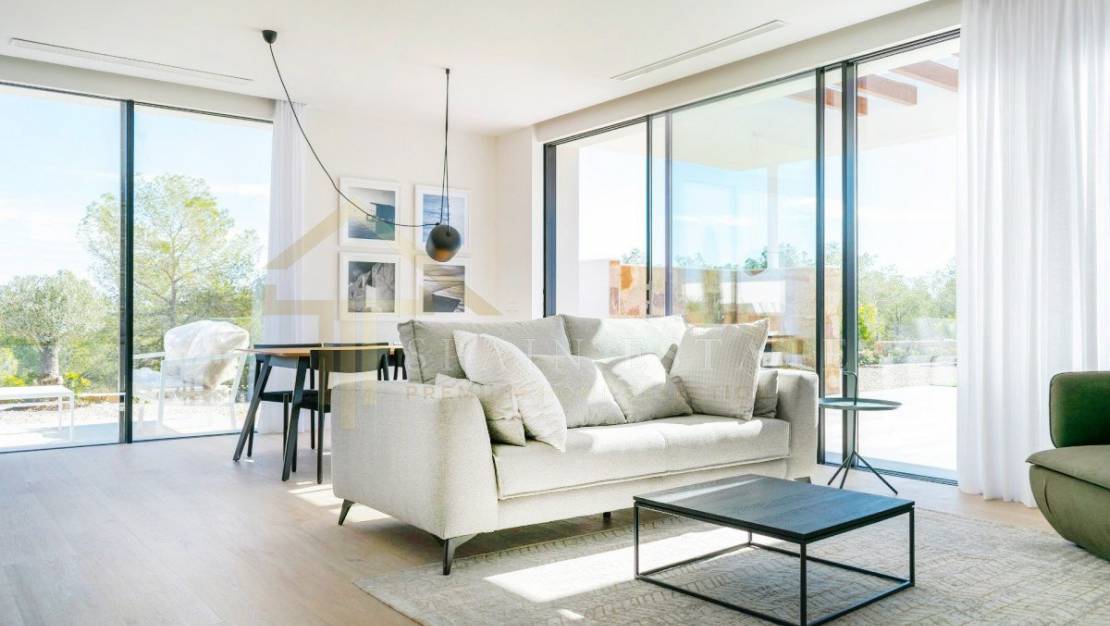 Villa med åpen stue, spisestue og kjøkken mot terrassen. Terrassedørene glir inn i veggen, som integrerer interiøret fullstendig med det ytre. På denne måten kan du dra full nytte av det vakre klimaet som tilbys på den sørlige delen av Costa Blanca. Soverommene er avstengt med en dør for å skille stue fra soveområdet. Her finner du 3 doble soverom med innebygde garderober og 2 bad samt et gjestetoalett. Hovedsoverommet har eget bad.