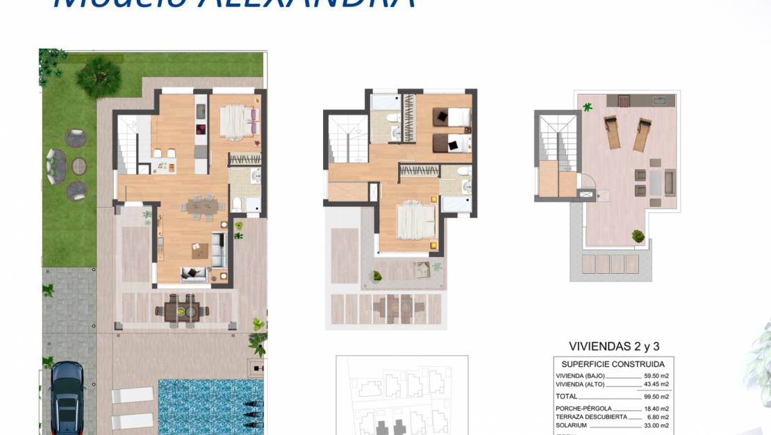 Modellen ALEXANDRA består av første etasje, høy og solarium med 3 soverom, 3 bad og kjelleralternativ, tomter på 206 m2, med et bebygget areal på 157,70 m2 hver. Første etasje er fordelt på stue, kjøkken, bad og stort dobbelt soverom, i øverste etasje har to soverom, to bad og solarium for å nyte solen og mikroklimaet i Torrevieja.