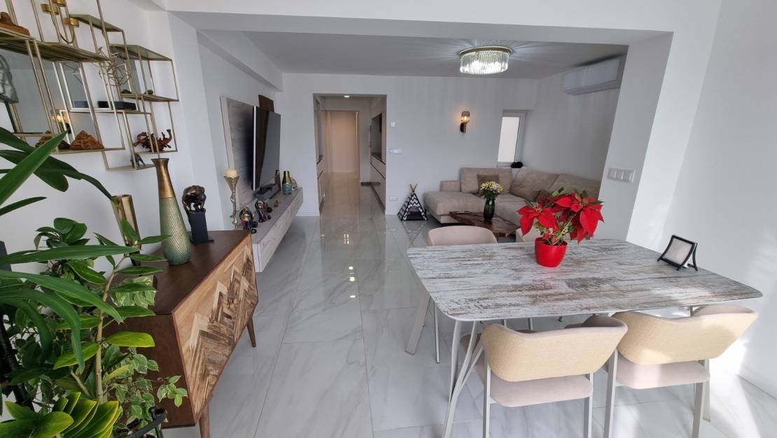 Den består av 2 soverom, 2 bad, en romslig stue med åpen kjøkkenløsning og en terrasse med vakker utsikt over havet, det nye forretningssenteret og herskapshuset.