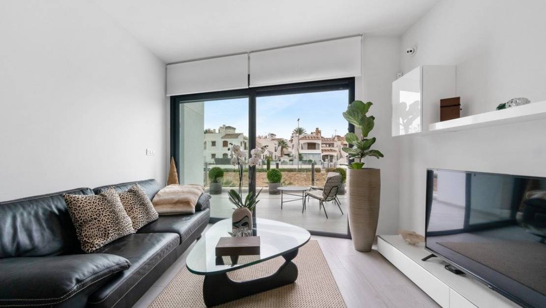 We are pleased to present this very beautiful top modern luxury apartment, new built with highest standards, barely used only few months, located in Vilamartin, close to several golf courses and all amenities and you may need The apartment have an open plan layout between the bright living room and kitchen, two spacious bed rooms( same size m2), with two bathrooms, from which one en-suite with the main bedroom with a lovely view towards the stunning pool and palm trees area. Both bath rooms have floor heating system. The 2nd bedroom [amp;] 2nd bathroom are never used. The kitchen is equipped with highest standard white goods of the brand Bosch [amp;] Electrolux, never used, with 3-5 years pre-paid warranty. The apartment has a spacious balcony ( 17,66m2) featuring beautiful white clinkers and glass combination, with a magnificent pool and palm trees view. The apartment is equipped with an automatic Home Control Management System and a very advanced Alarm system with motion detectors in every room [amp;] balcony. The property has a designated underground parking space and a very spacious storage room. The apartment is furnished with leading brands design furniture, which are partially included at the listing price. The entire furniture pack [amp;] additional design furniture are available upon request. In the surroundings you can find nice restaurants, coffee shops, supermarkets and just few minutes drive several golf courses as Vilamartin Golf , Las Ramblas Golf or Real Club de Golf Campoamor Within a short drive you can reach one of the biggest shopping centre in the area, La Zenia Boulevard or the lovely beaches of Orihuela Costa.