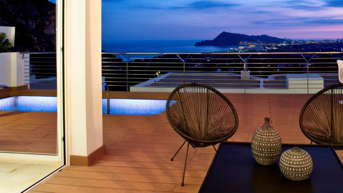 A residential estate full of light, with large interior spaces, unique architecture and natural surroundings, panoramic views of the Mediterranean Sea and the skyline of Benidorm.