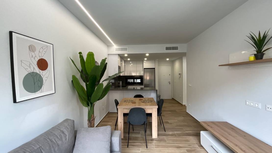 This apartment has a spacious and bright living room, a fully equipped open-plan kitchen, two bedrooms, two bathrooms and a large terrace. It is practically brand new, fully furnished and available immediately. The apartment has air conditioning (heating and cooling).