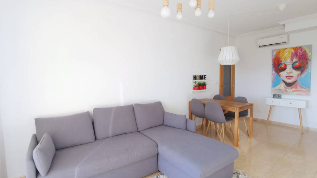 В квартире 2 спальни, каждая с кондиционером, одна с двуспальной кроватью, а другая с двумя односпальными кроватями, 1 ванная комната, 1 отдельная кухня, 1 гостиная с кондиционером и терраса с видом на море.