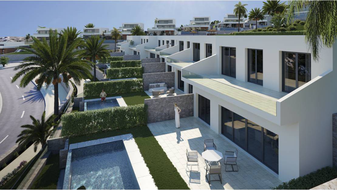 Таунхаус с частным бассейном, desño moderno, на первом этаже - гостиная с кухней открытого типа, 1 спальня с двуспальной кроватью, 1 ванная комната и 1 туалет; На первом этаже расположены 3 спальни с двуспальными кроватями, 2 ванные комнаты и большая терраса с панорамным видом.