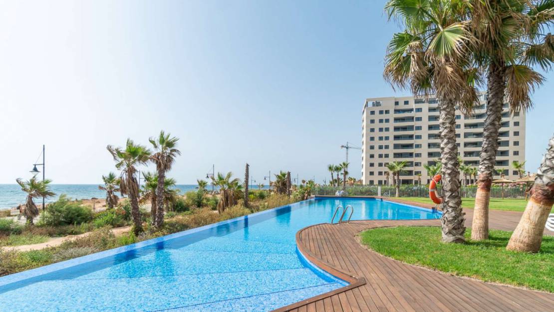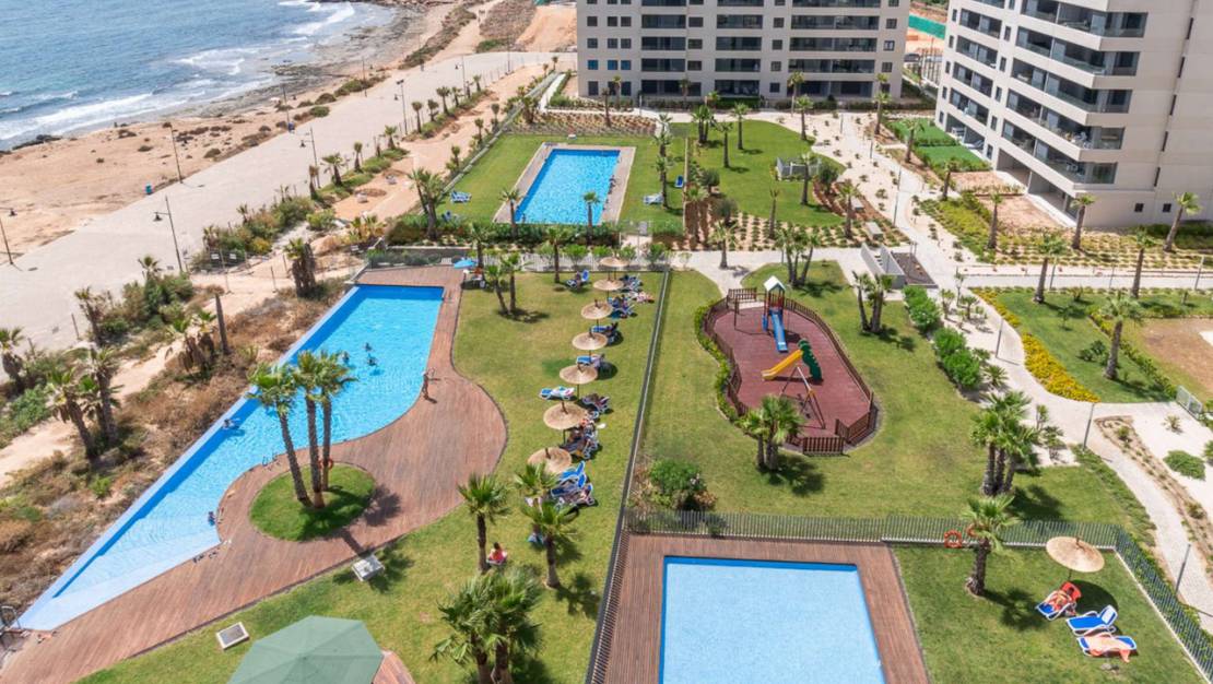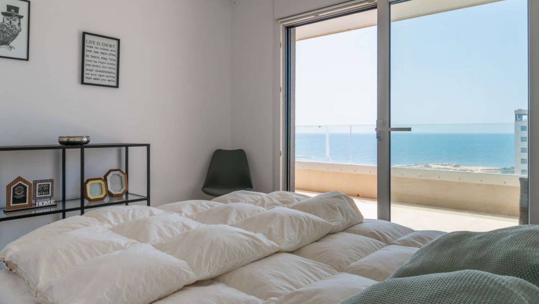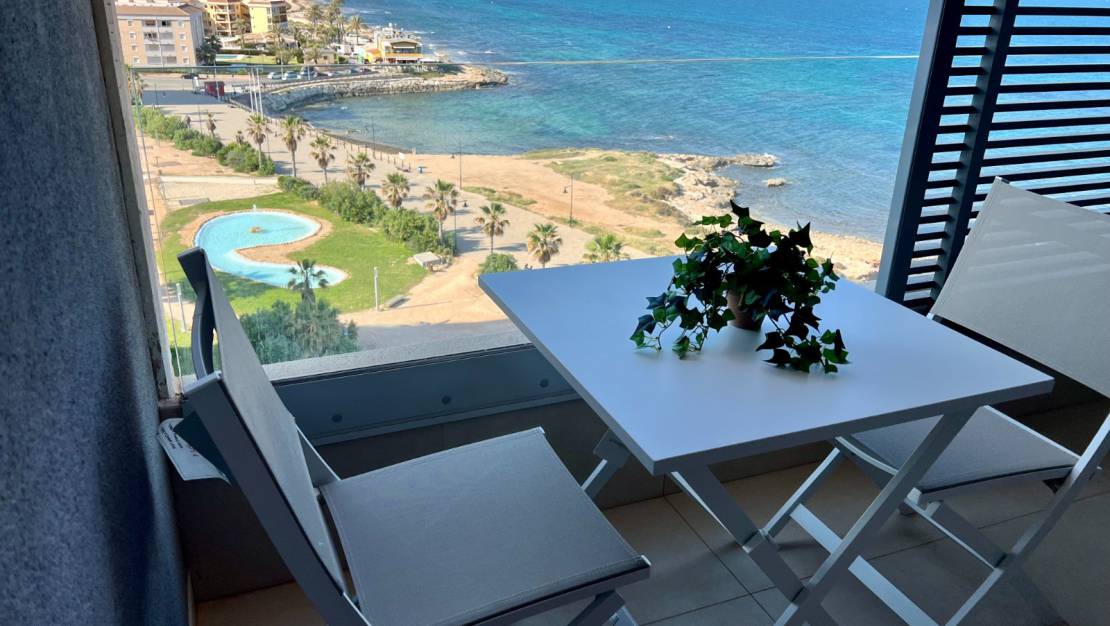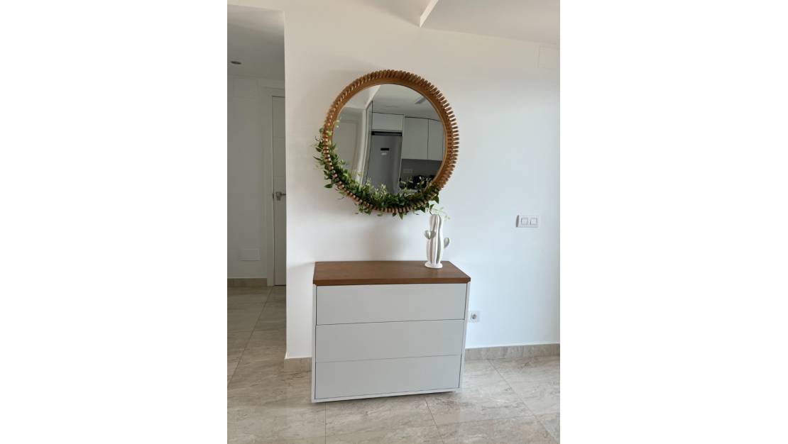 Роскошная квартира с 2 спальнями и 2 ванными комнатами, гостиной с открытой кухней и большой выходящей на юг террасой с захватывающим видом на море и местами общего пользования с несколькими бассейнами, тренажерным залом, джакузи, сауной, детской и спортивной зонами. На северо-востоке есть еще одна терраса с видом на море и Торревьеху. Также имеется собственная подземная автостоянка.