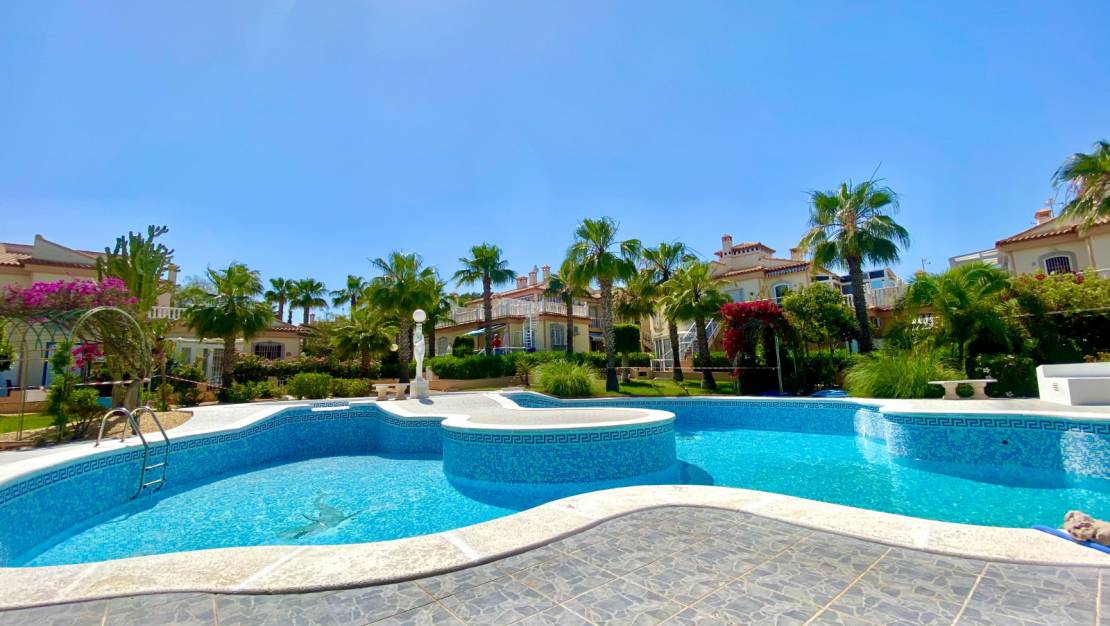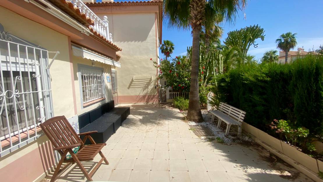 Denna enplansvilla med privat pool till salu i Torrevieja ligger i området Los Frutales, en kort promenad från stränderna i Calas och Los Locos. Bara 3 minuters bilresa från stranden La Mata.