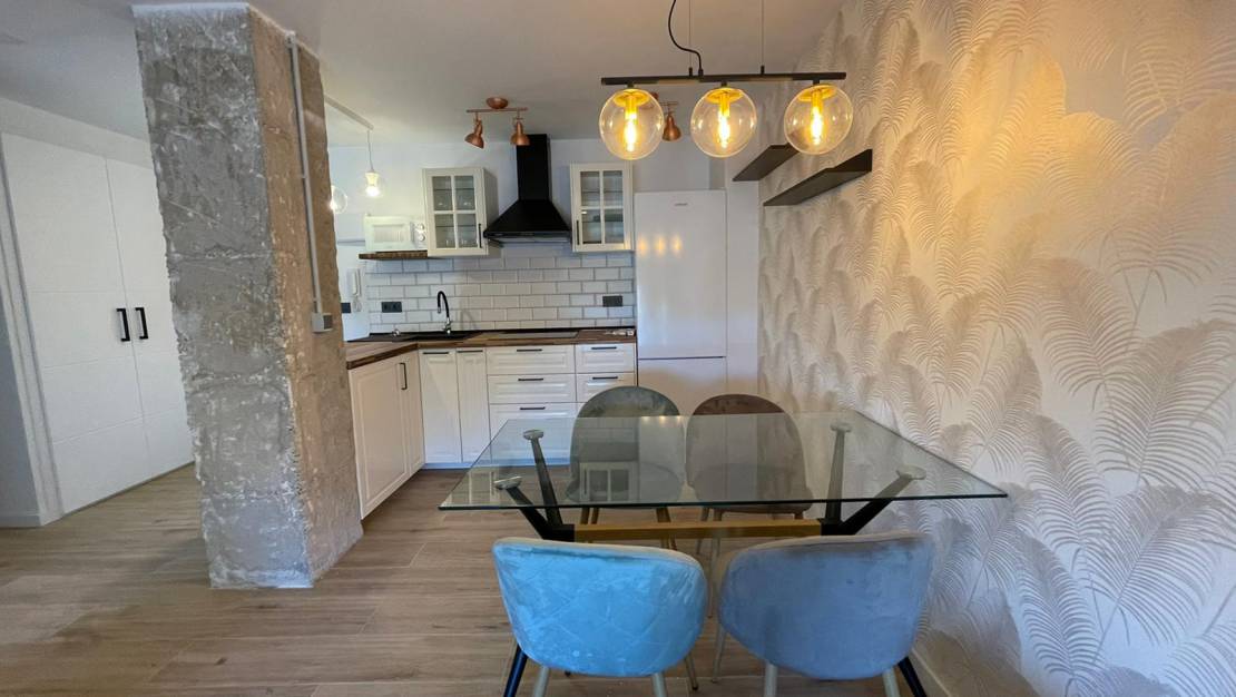 Vacker lägenhet med 2 dubbelrum, båda med sin TV, 2 badrum, med en stor terrass, luftkonditionering i hela lägenheten, det är inrett med stor smak, köket med alla nödvändiga tillbehör och apparater.