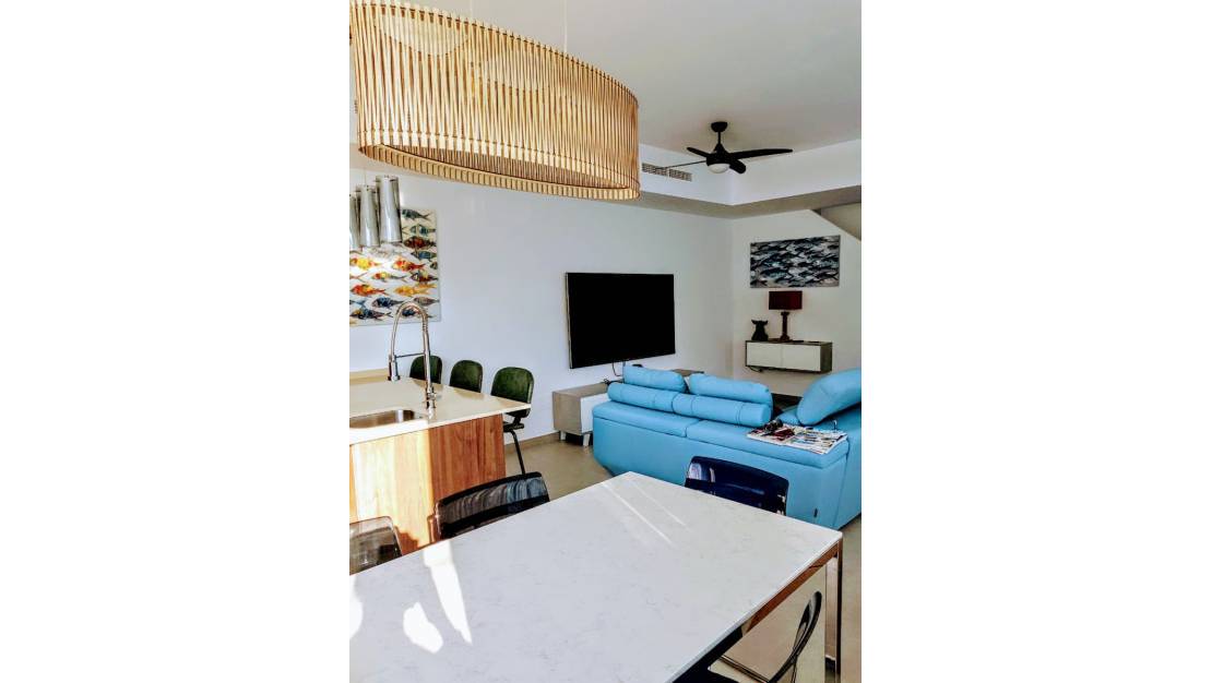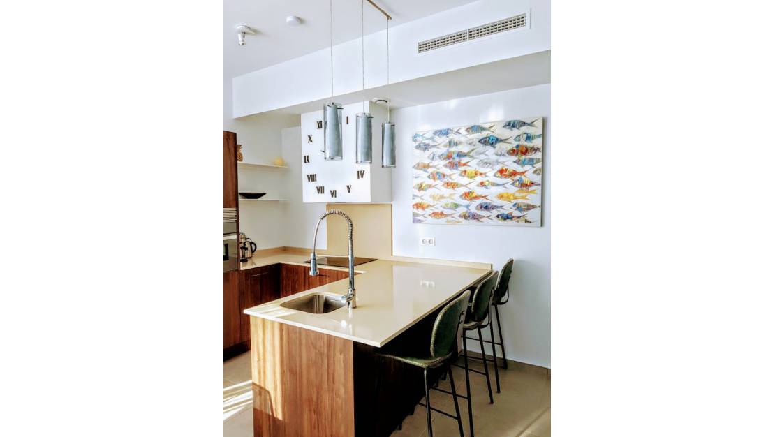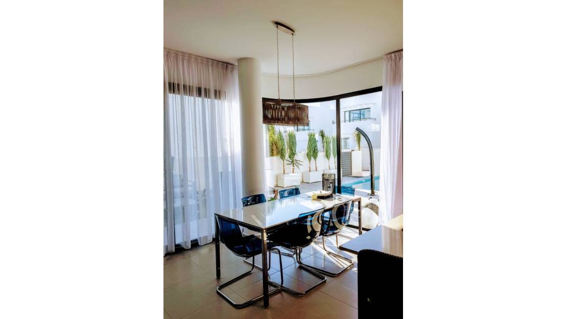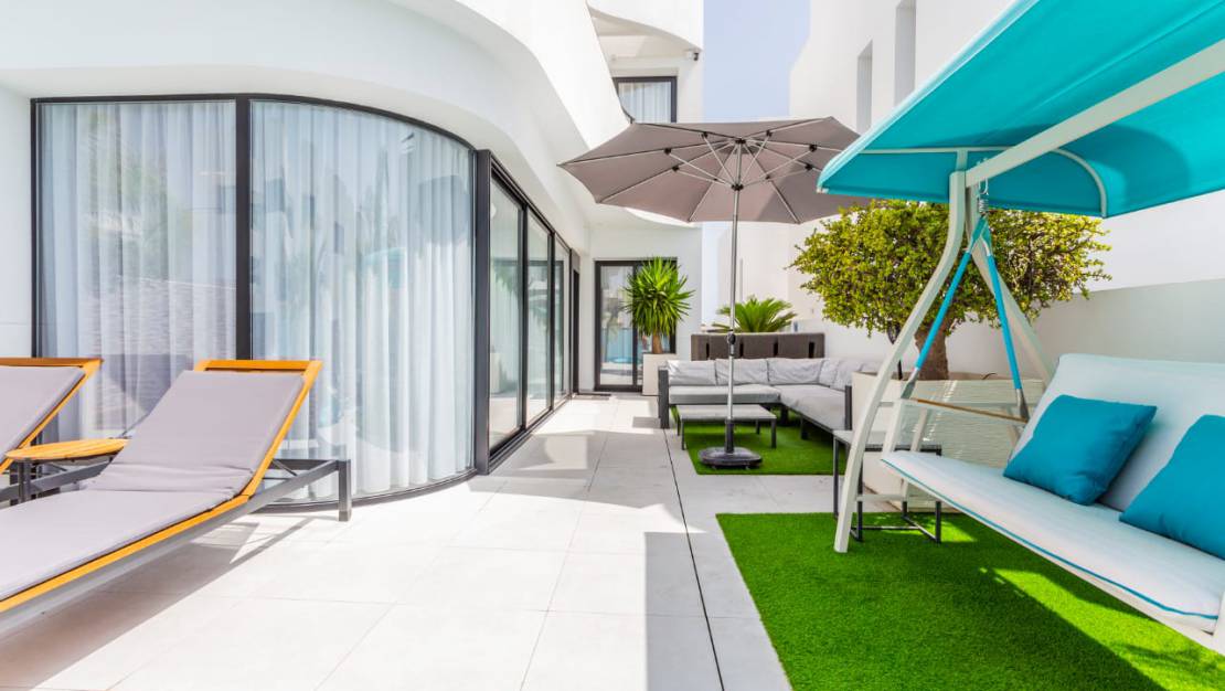 Huset har två våningar och är fördelat på ett rymligt och ljust vardagsrum med öppet kök, tre sovrum, tre badrum, en terrass och ett solarium. Utanför finns den privata poolen med trädgårdsmöbler och grill.