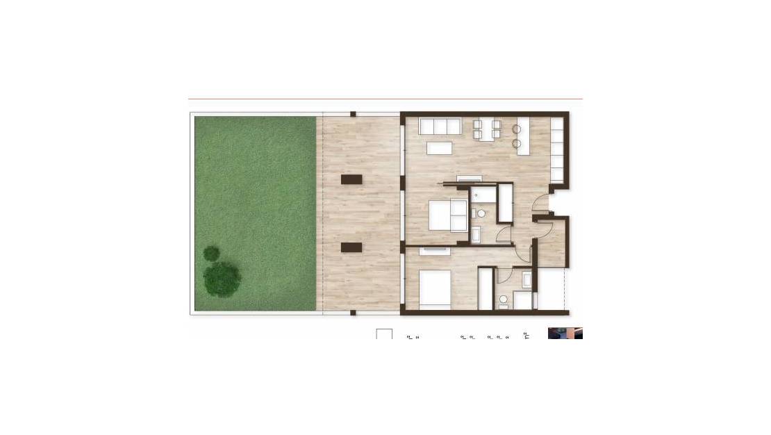 Açık plan mutfaklı oturma odası, 2 yatak odası, 2 banyo ve bir teras (37,17 m2) ve 53,47 m2 bahçeden oluşan bir dış alan dağıtılmıştır.