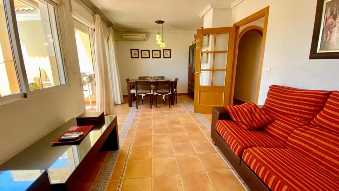 Güneşli bir terasa erişimi olan oturma odası, tam donanımlı ve donanımlı mutfak, 3 çift kişilik yatak odası ve 2 banyodan oluşan geniş üst kat daire.